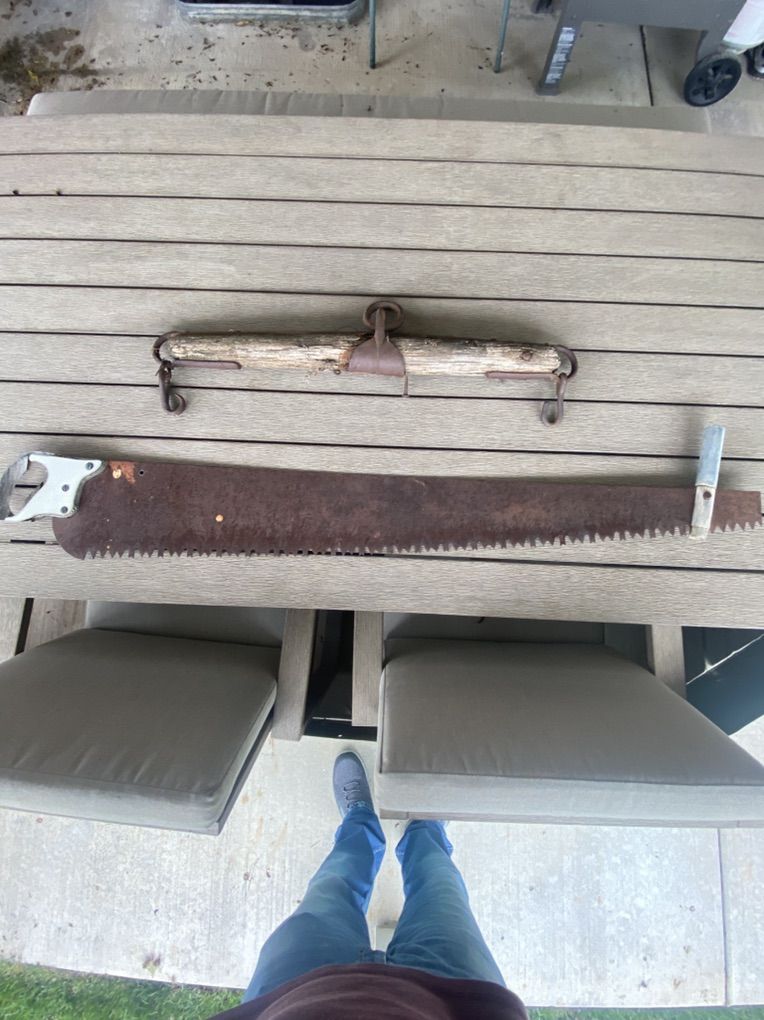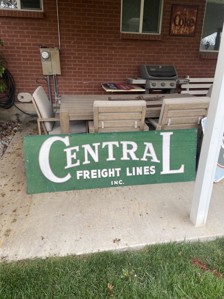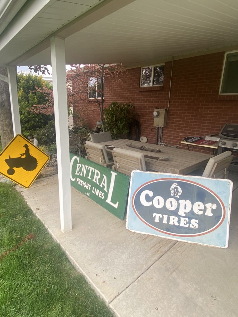 Cooper tire sign is painted metal single sided 45 x 30 will clean up nicely with a little wax. Central freight single-sided painted metal 74 x 24 The Saw and the Yolk I will throw in with the deal.. $250..