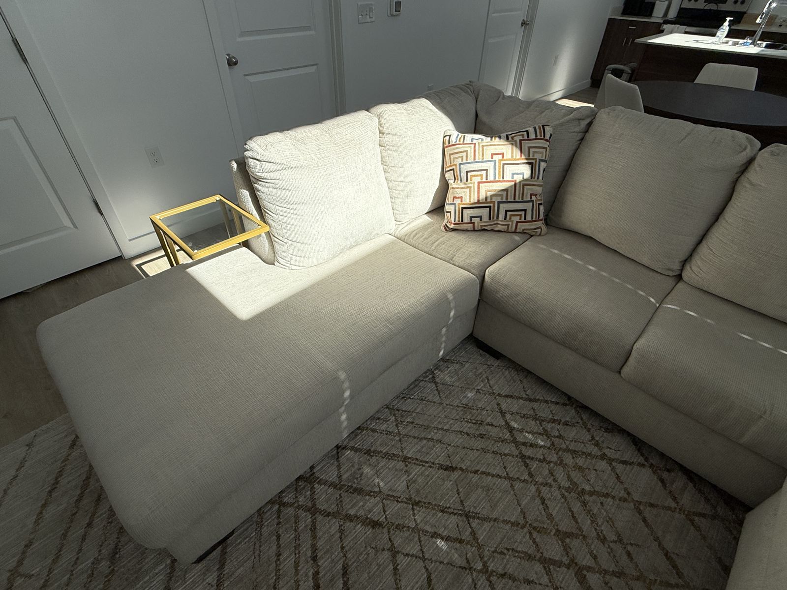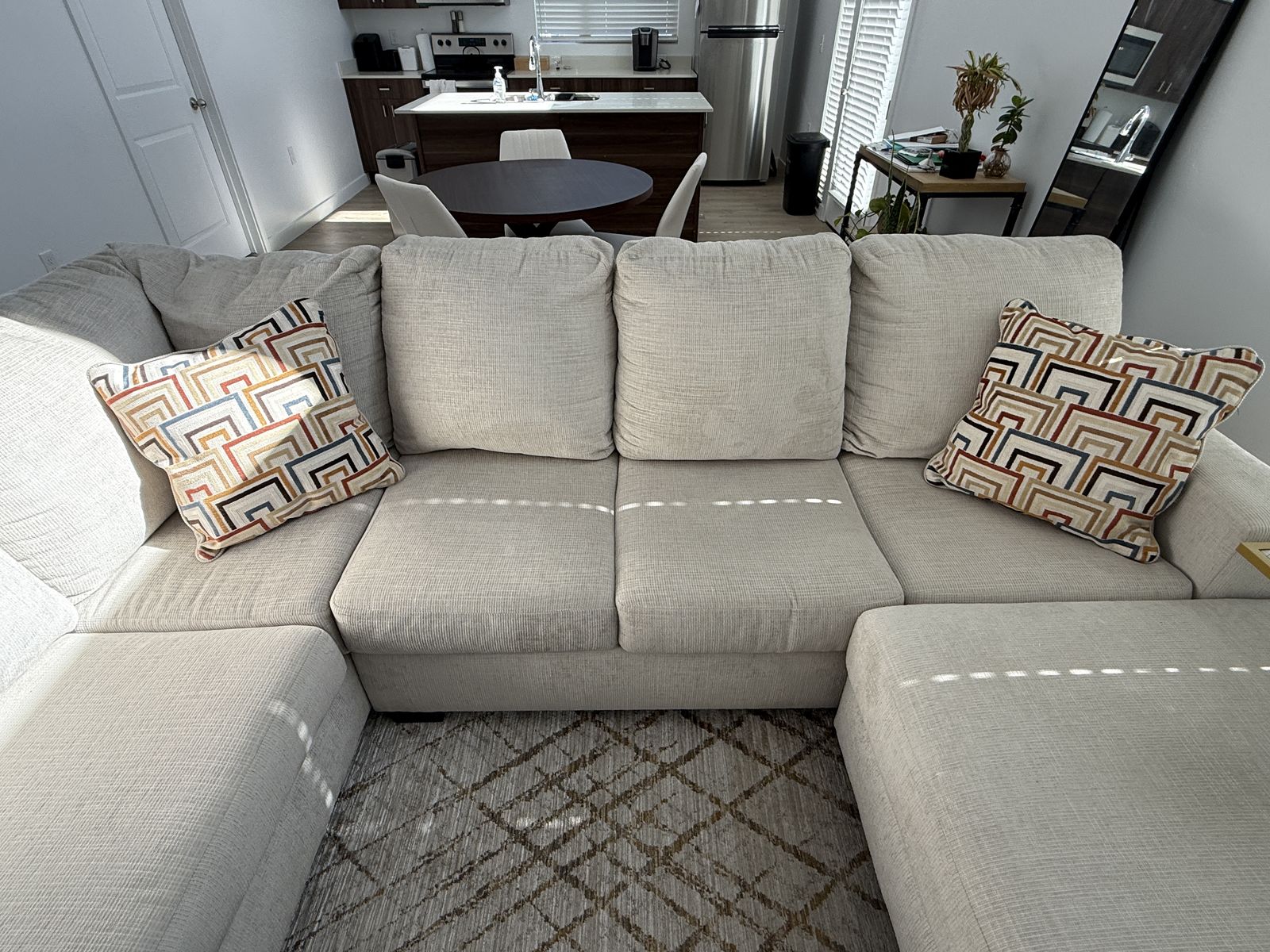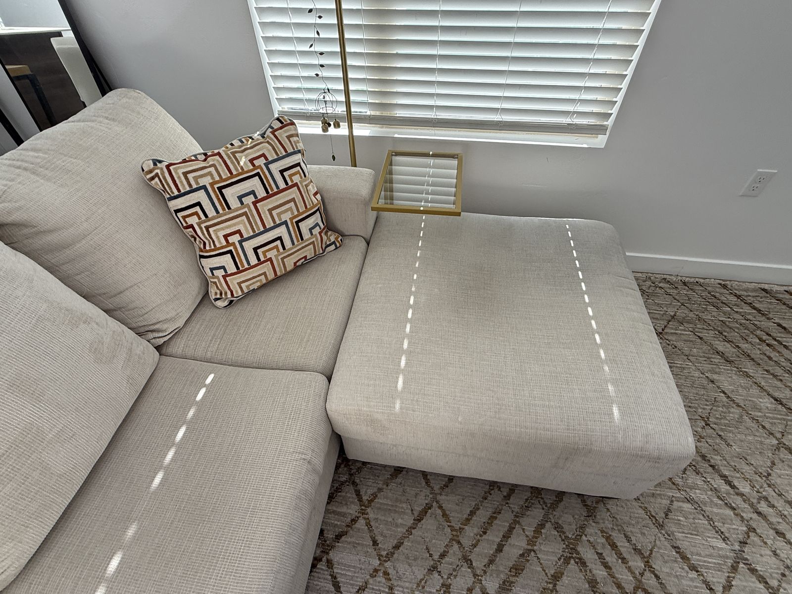 ZelleThe sectional has been vacuumed and there is little wear. It’s very comfortable and super easy to keep clean, all the seat covers come off for washing. The ottoman (seen on the right, not part of the main couch) is a little dirty from feet, but it isn’t stained. Fabric cleaner will make it like new.