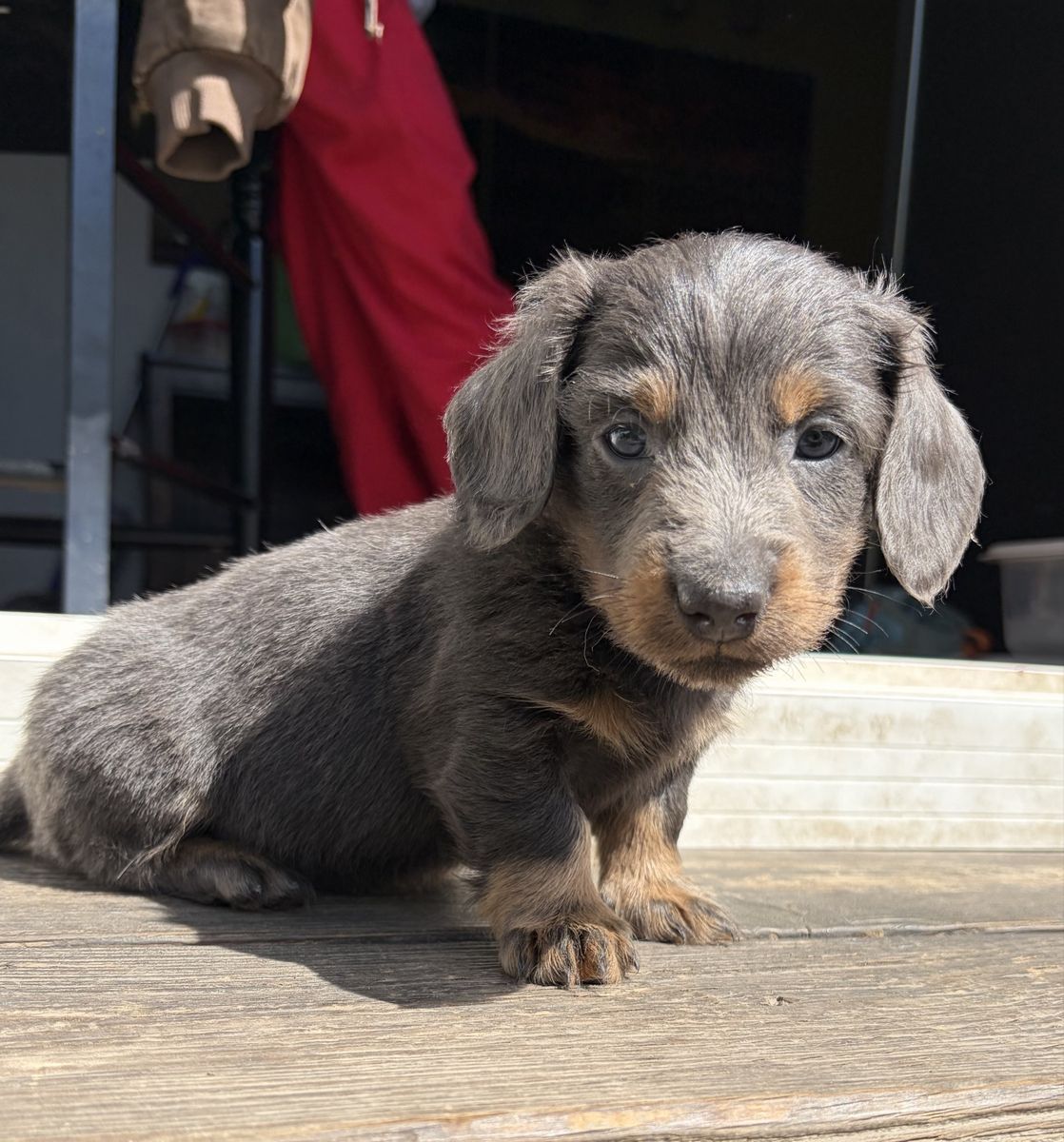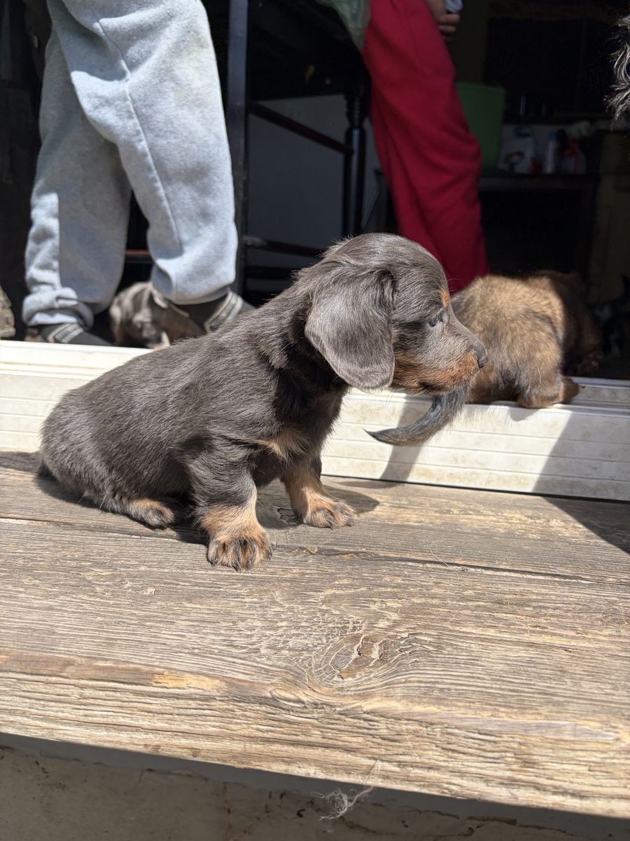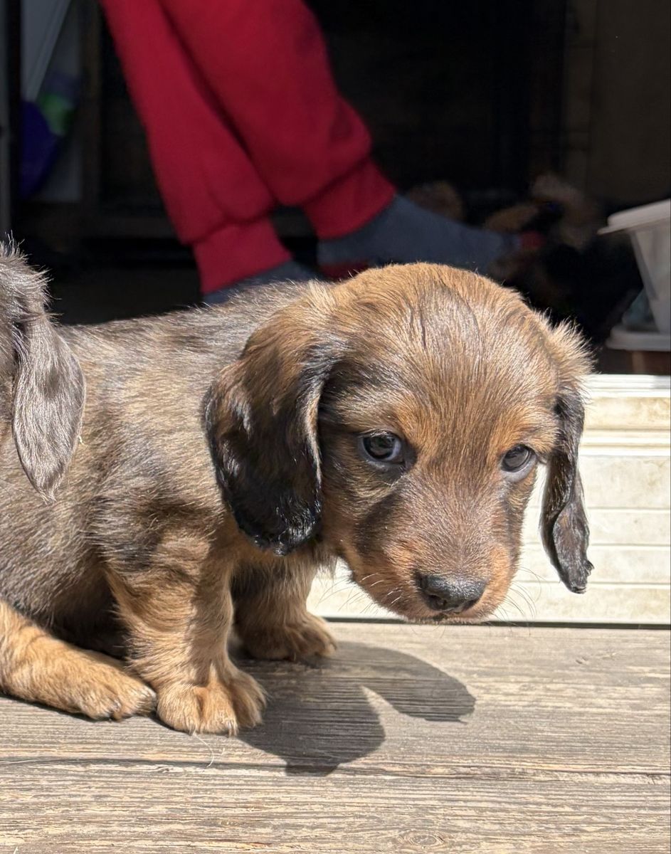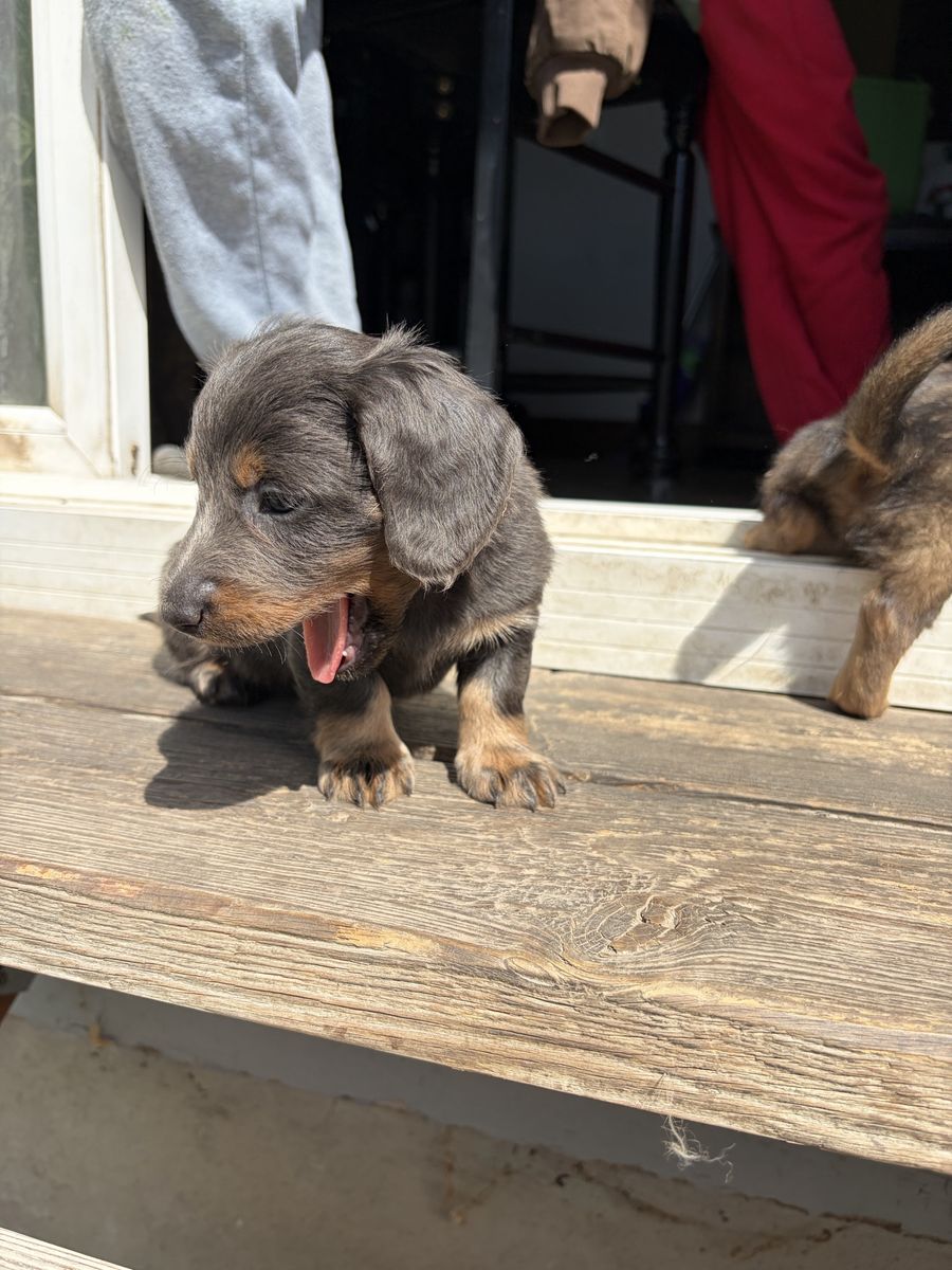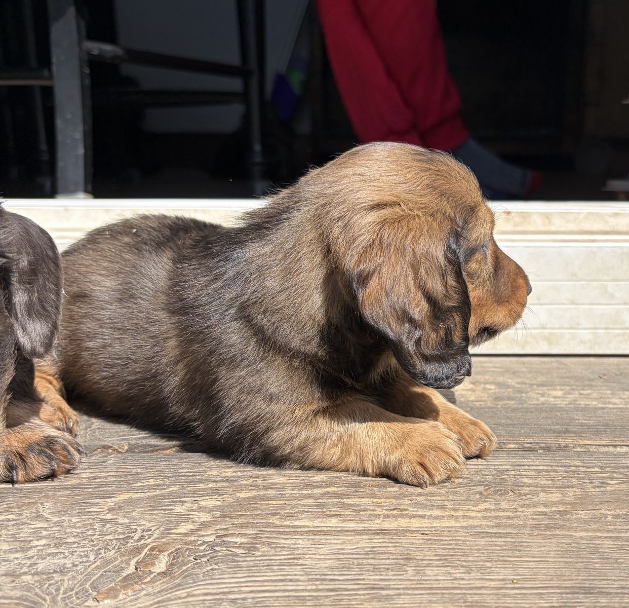 Pups are from a litter of 5, these are the only two that weren’t claimed before they were even born, from previous happy customers. The mom is a shaded red long hair akc mini dachshund and the dad is a black and tan dapple mini dachshund. They have had 5 litters and all have been happy, healthy dogs when grown.