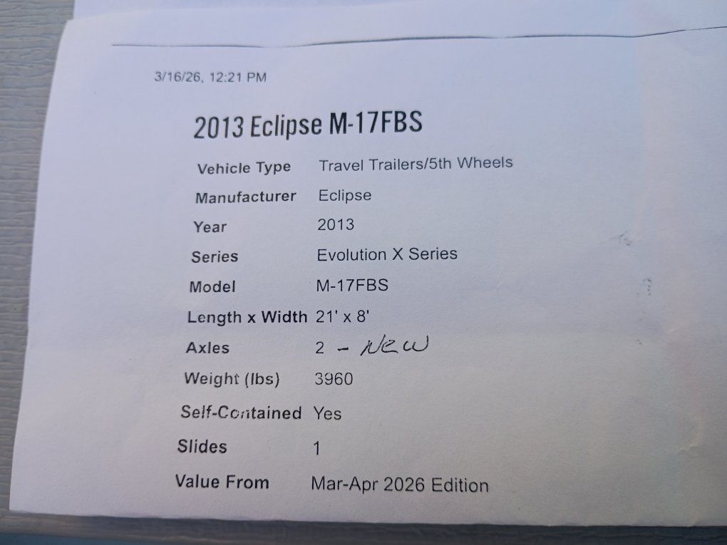 very nice Travel Trailer, 2013, 21 feet by 8 feet wide. Has 13.5 btu air conditioner, awning, microwave, TV with DVD AM FM CD, outside shower, fuel pump station and spare tire with carrier. call Mike for more info at 801-644-8375