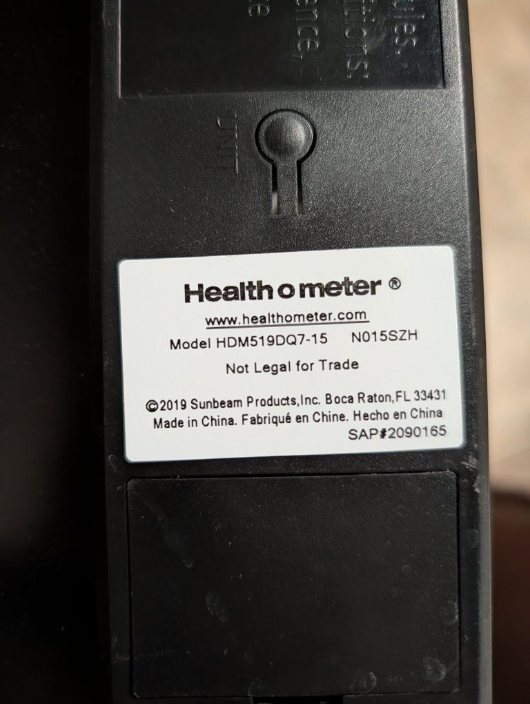 ZelleBrand: Health o meter Model/Type: Digital Bathroom Scale Model Number: HDM519DQ7-15 Weight Capacity: 400 lbs (181 kg) Color: Black / Carbon Fiber Pattern