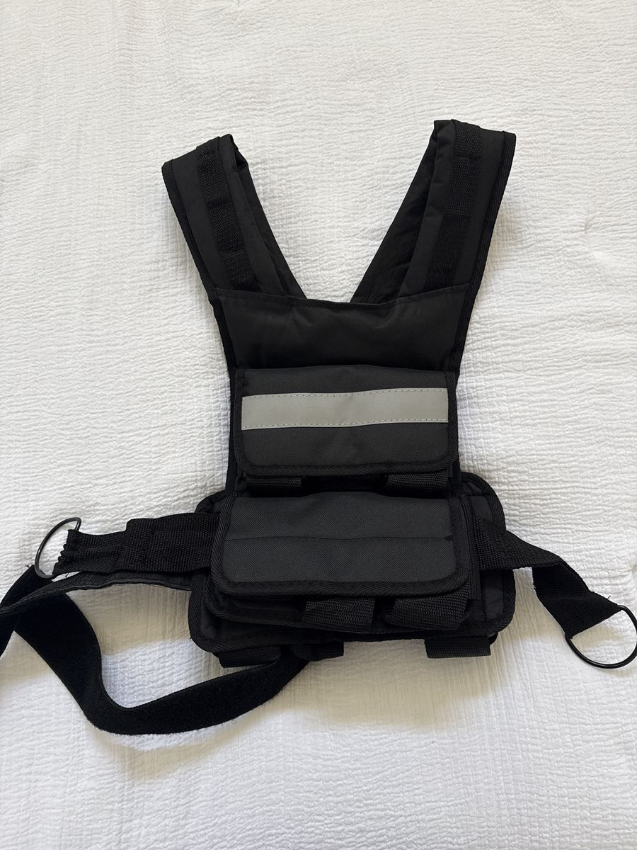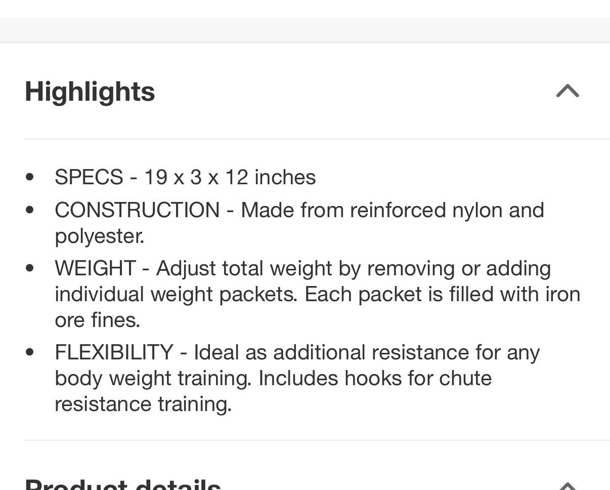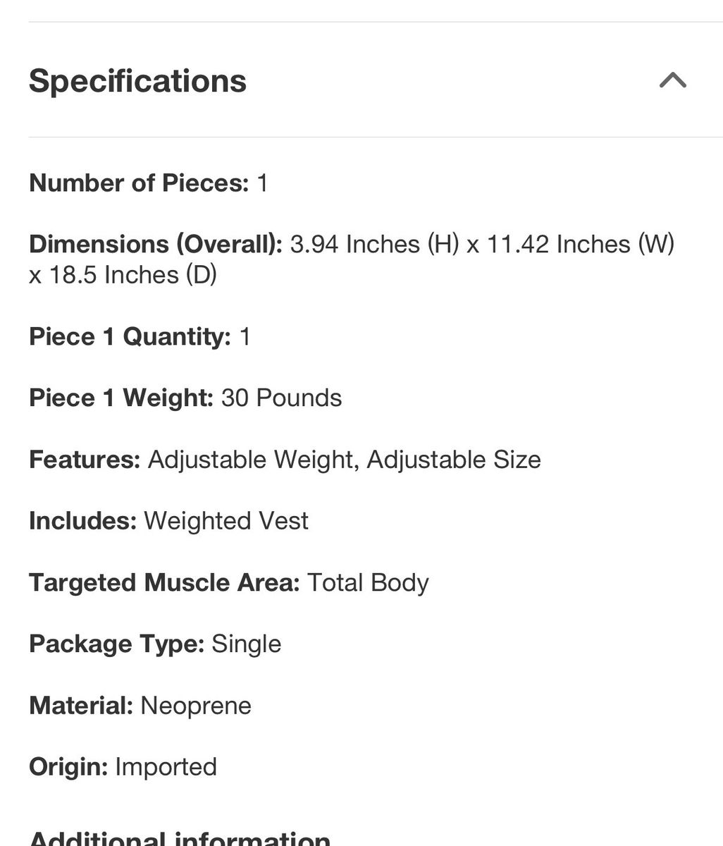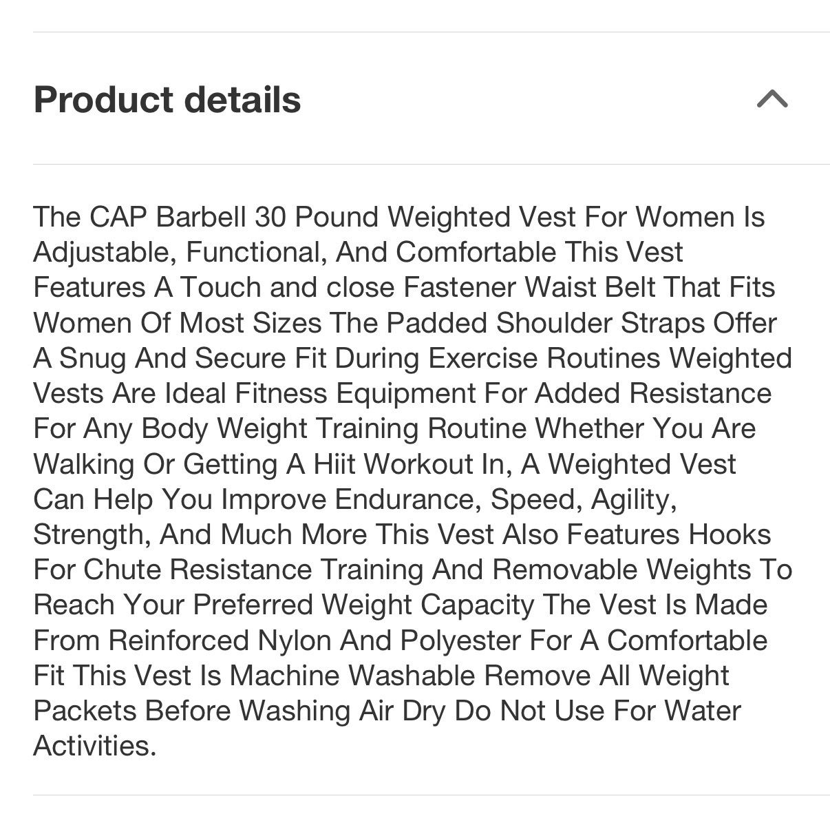 VenmoCAP weighted vest. Can add up to 30lbs of weights. Start low and work up. It’s sold as a women’s vest but is too big for me. I wear an XS top. Definitely fit a medium or larger size female or a male better. Purchased online at target a year ago and wore a couple of times. See product info about this product in attached pictures.