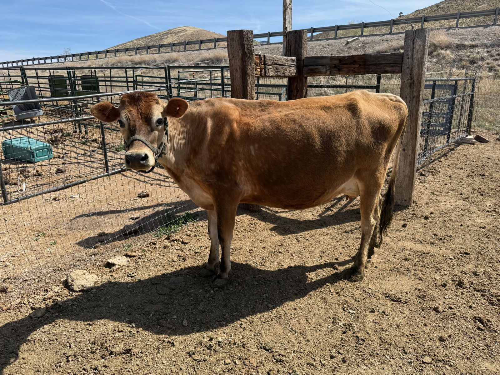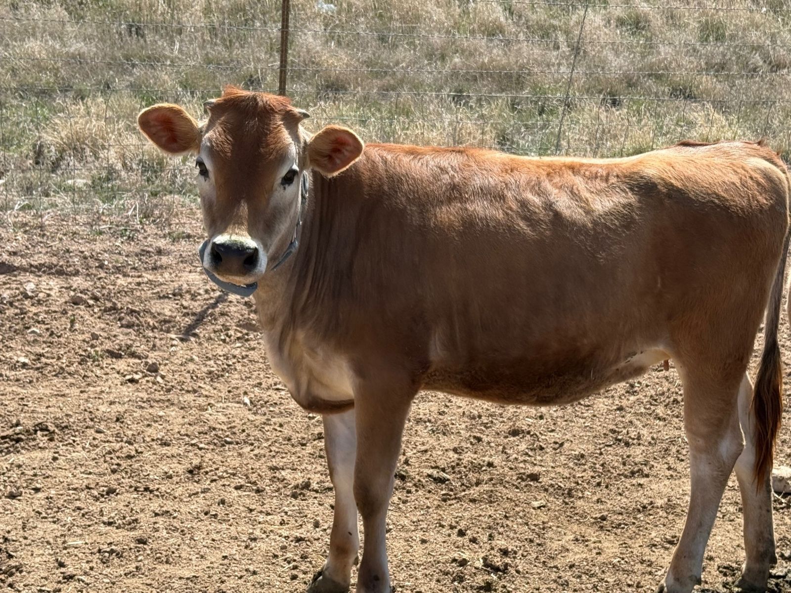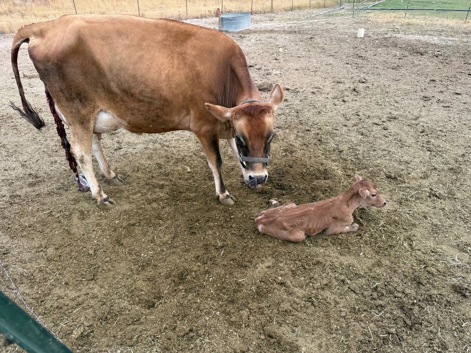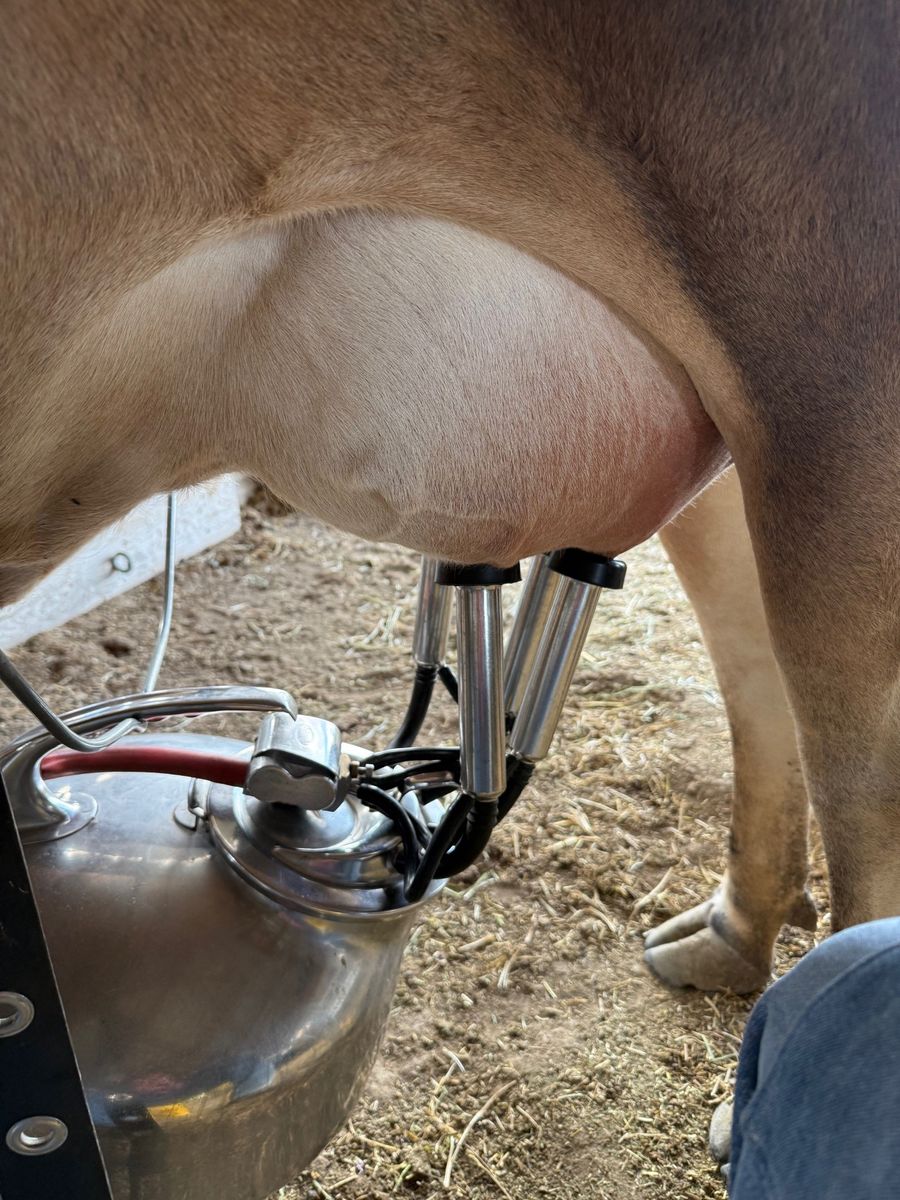 Meet Lucy Belle. This is a three year old very nice Jersey cow born May of 2023. She had her first calf, a Jersey Heifer born August 15, 2025 so now the calf is 8 months old. We left the calf on the cow and milked her once per day. She gave about 2.5 to 3 gallons per day when milking once per day. When our other heifer freshened we grafted the new calf on Lucy and stopped milking her as we didn't need all the milk. She has been bred by a Herford bull and is due in September. She still has the two calves nursing on her so she should give plenty of milk till she is dried up in July. Her pregnency was confirmed by a vet. She leads easily into the stall. The last picture is her 8 month old calf. If you want the heifer calf so you don't have to milk as much I will sell her for $1200 with the cow.
