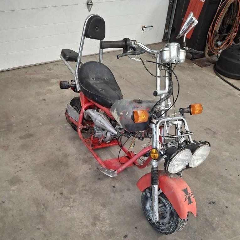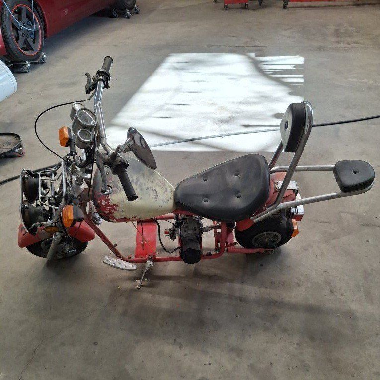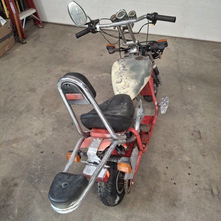 49 cc APC mini chopper. pretty rough. tires appear good but are flat. engine turns freely but the wiring and fuel lines are a mess. battery is missing.