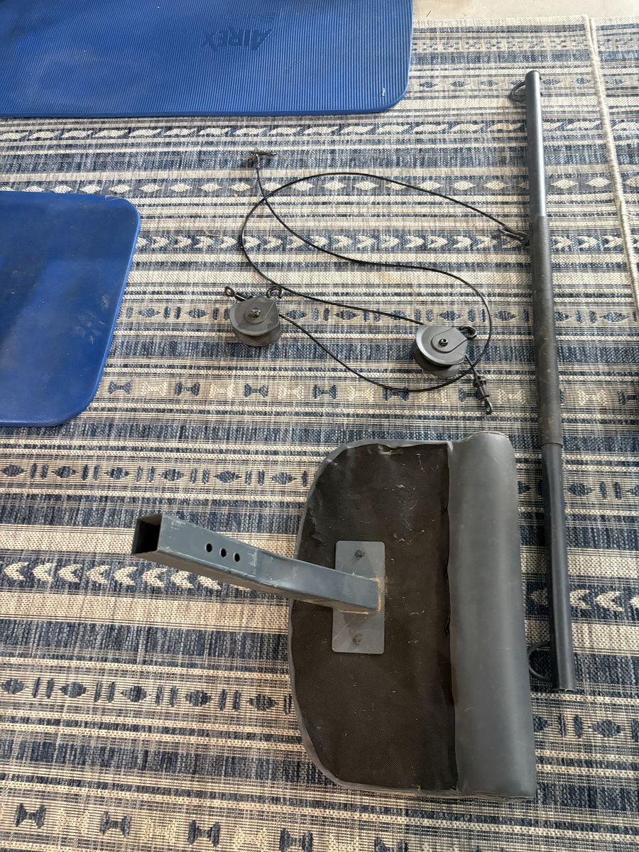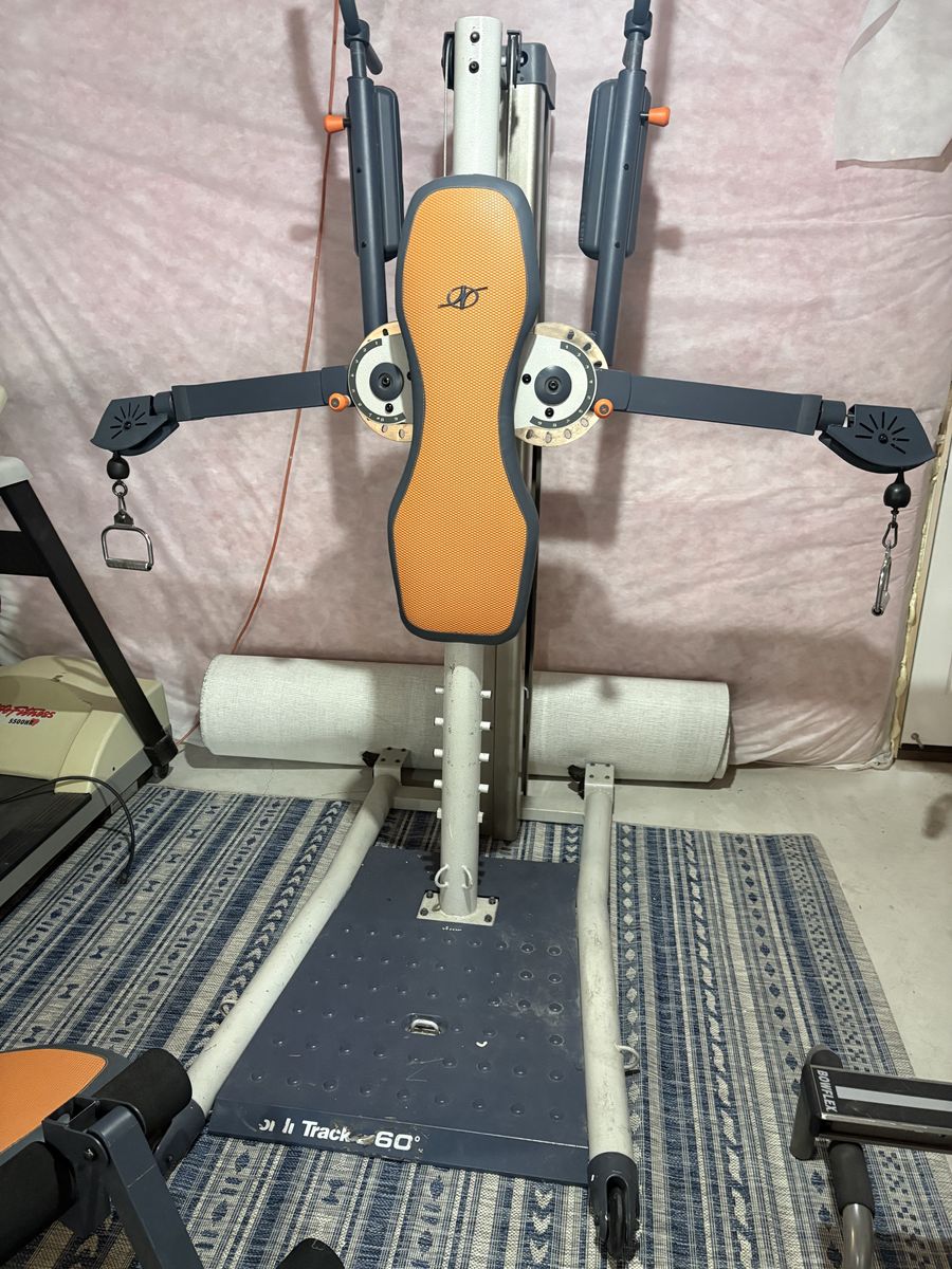 Works great! Freemotion Ajustable arms. Full body workout. Moves around easily with wheels attached to base of machine that lock in place.