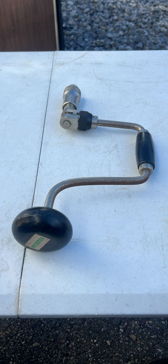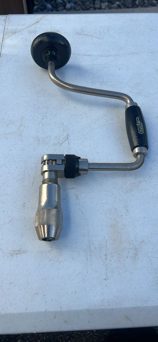 GooglePayThis is a vintage Fuller ratcheting hand drill bit brace, likely from the 13-inch size variant. Type: Ratcheting bit brace for manual drilling. Material: Metal construction with black wooden handles and knob. Features: Includes a right-angle ratchet mechanism for bidirectional drilling in tight spaces.