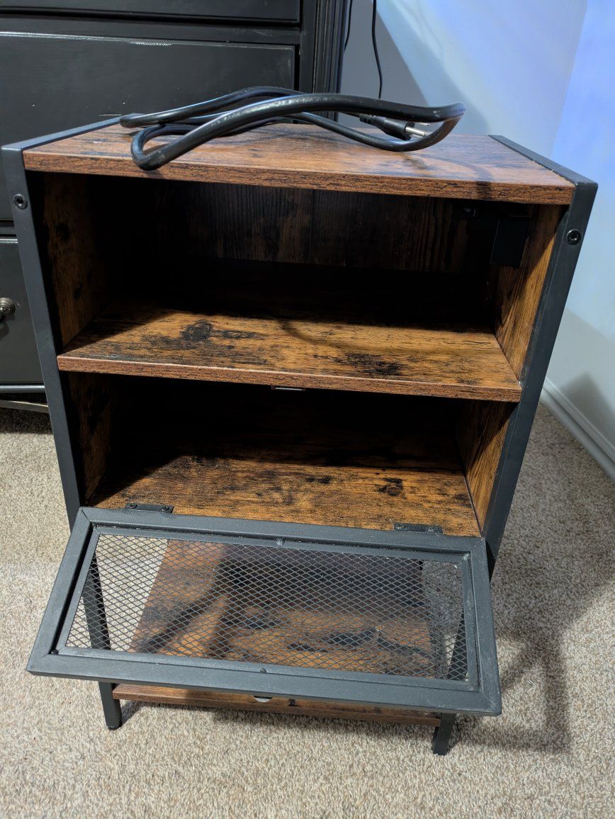 Electric Night Stand/Stand/End Table. It's Metal and Wooden Colored, just needs a little cleaning but great condition. $25 Cash Only, You Pick Up. 25"inches Height. 12" inches Deep. 16" inches Long.
