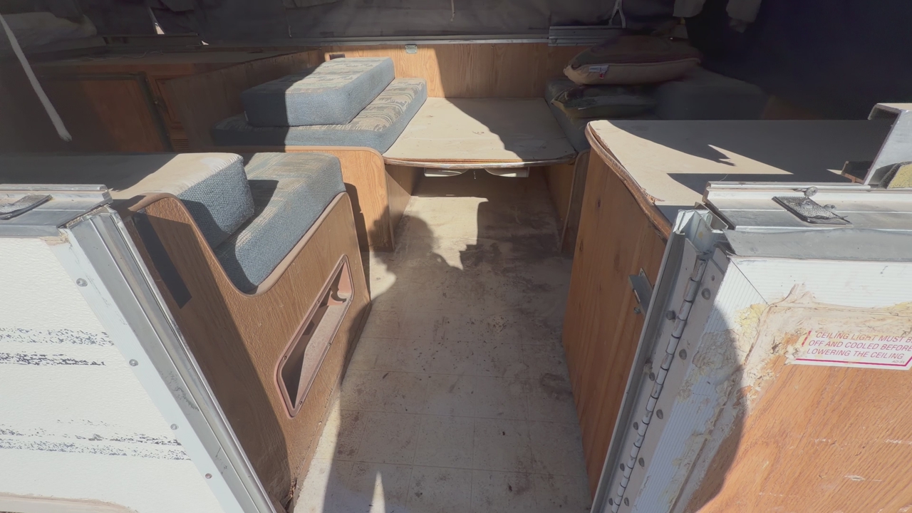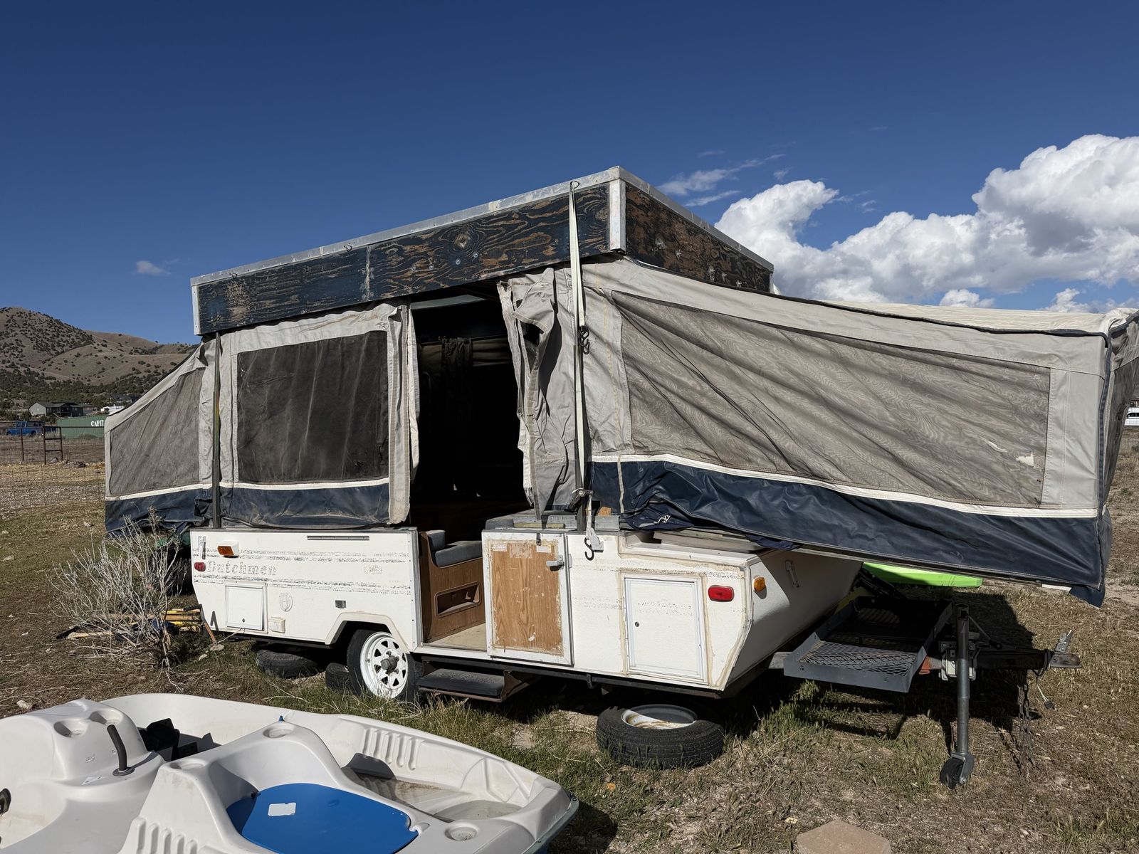 GooglePayThis would be a tear down project, use for parts, or make your own utility trailer or something with the frame/axel. The lift system works great, the cushions are still good, but the canvas is total trash. lots of little useable parts or just tear it down and make it into something of your own. The tires are good and lights, and will tow. I camped many times in this, long time ago. I rebuilt the roof myself, but didn’t seal or finish it right and over the years, it’s worn down and leaked as you can see. $500 Located near Tooele