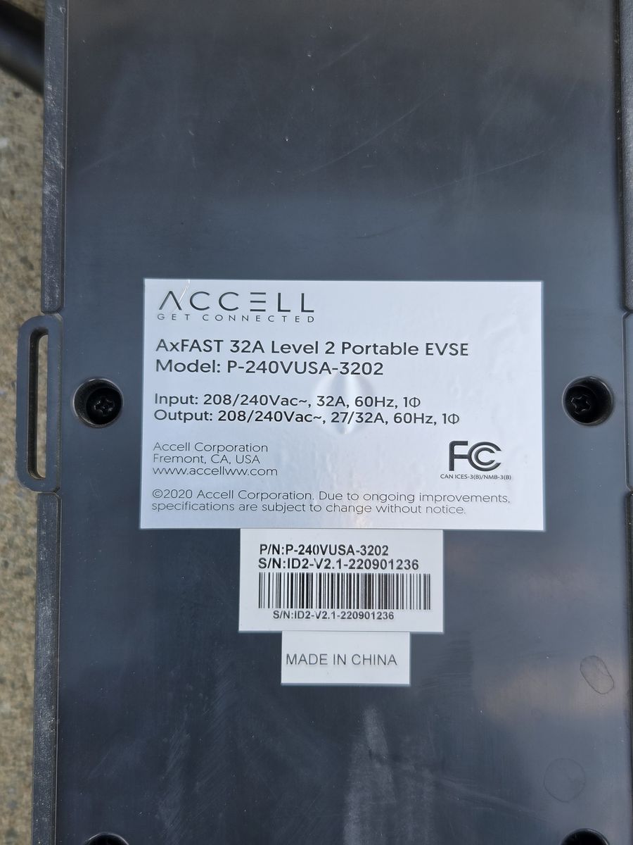 VenmoACCELL AxFast Model 3202, Level 2 Portable EV Charger. Gently used. Includes NACS adapter and a 4-to-3 prong 240 V electrical adapter.
