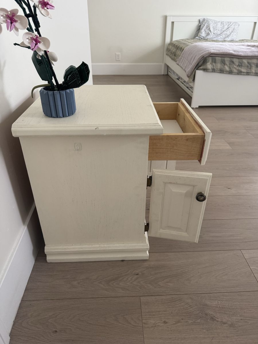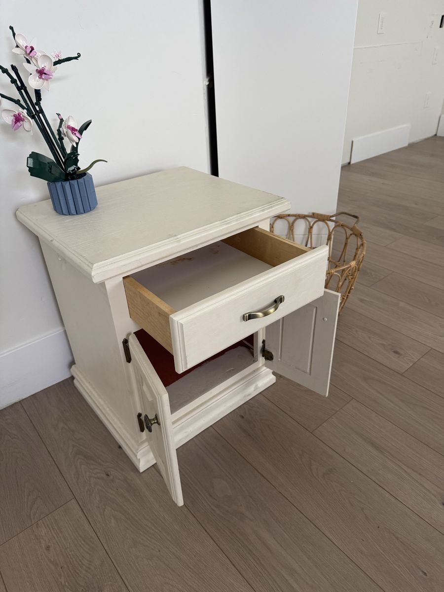 Features: • Smooth-glide top drawer for easy access storage • Bottom cabinet with doors for extra hidden storage • Solid wood construction – heavy and well-built • Neutral white finish that matches most decor styles • Compact size, great for smaller spaces