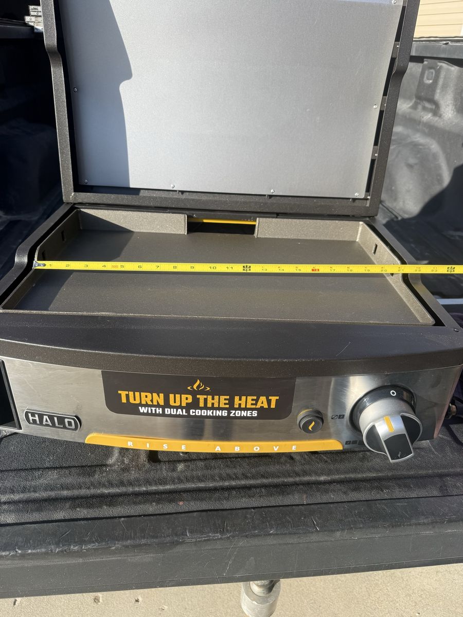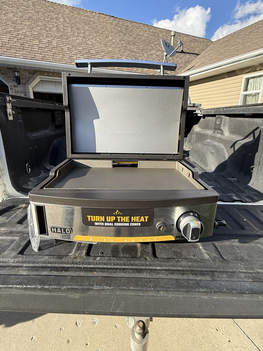 VenmoBrand new, never used HALO Elite1B Outdoor Countertop Griddle. It has patent-pending dual-zone burner eliminates cold spots, while the wind-protected design guarantees precise. Choose between one or two cooking zones-use a single zone to keep food warm or fire up both for a wall-to-wall sear zone. With a 10-minute warm-up and a 300-600°F range, you'll be cooking like a pro in no time. Unlike any other griddle on the market, the hinged lid is designed to be part of the cooking process. Cook open or closed. Steam, melt, or retain heat with a smart lid designed to expand your cooking options and resist wind. Cleanup is a breeze thanks to the built-in utensil scraper and oversized grease bucket. Portable, propane-ready, and built for the outdoors.