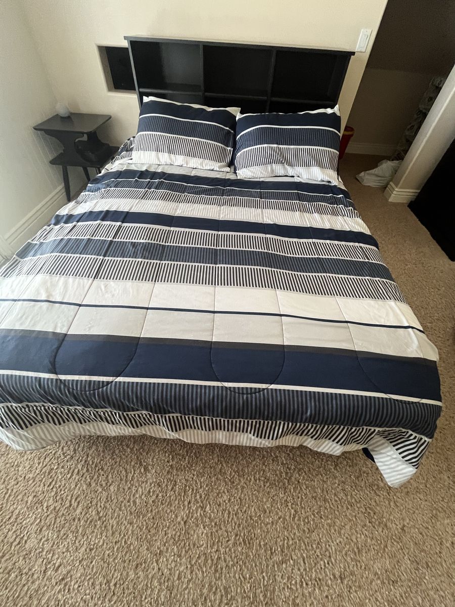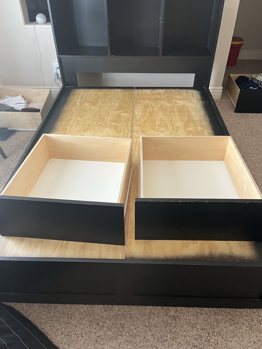 VenmoFull Mattress custom built black full-size bed with six drawers, excellent shape it's 54 1/2 inches wide and 76 1/2 inches long with or without the headboard, with the headboard it's an additional foot. The headboard has three large storage containers and also three shelves if you want to split it in half comes with a full-size mattress Mattress Check pictures for Details. The drawers are 21" x 23"