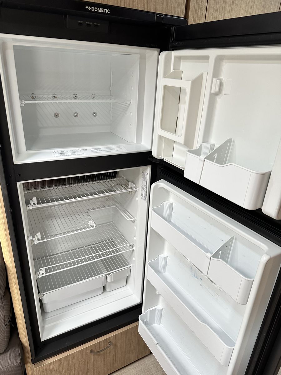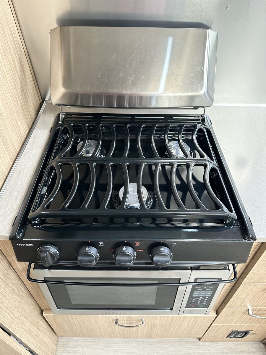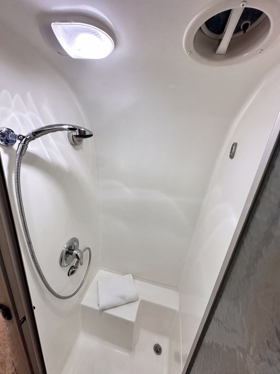 • Front queen bed • Convertible dinette / extra sleeping area • Pull-out lounge for additional sleeping space • Comfortable extended seating area • LED lighting with dimmer switches throughout • Solar panels • Inverter • Microwave • 3-burner stovetop • Large kitchen sink • Large refrigerator • Sound system with radio and Bluetooth throughout • Two TVs with satellite • Exterior awning • All systems tested and functional