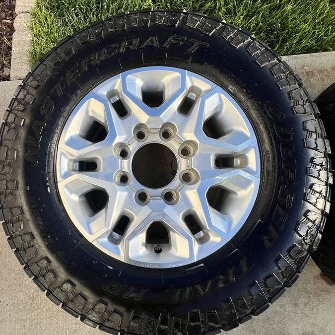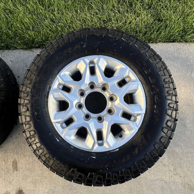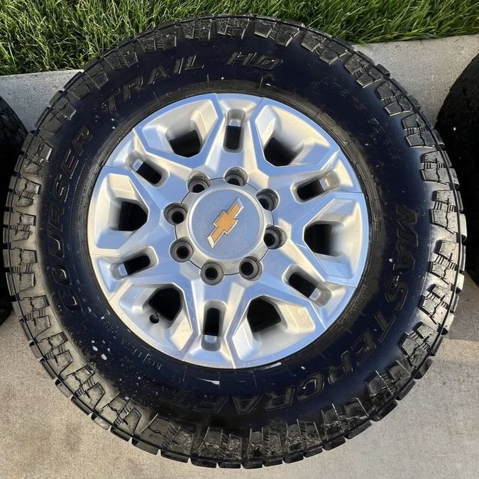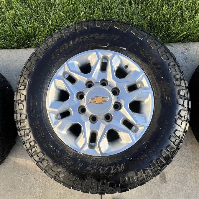 VenmoTake offs from a 2024 GMC 2500. 2 with center caps 2 without. Good tread on all tires, minor cosmetic blemishes on the wheels, but nothing really noticeable. Very good condition. Square set up, 275/70R18 tires on all 4 corners. Bolt pattern is 8 on 180, will fit all 2011 and newer Chevy and GMC 2500 and 3500 trucks. Hold air with no punctures. Came off my new to me truck, only replaced because I wanted aftermarket wheels. Great condition wheels and tires, fairly firm on price, might consider trades, so let me know what you got. Worse I can say is no.