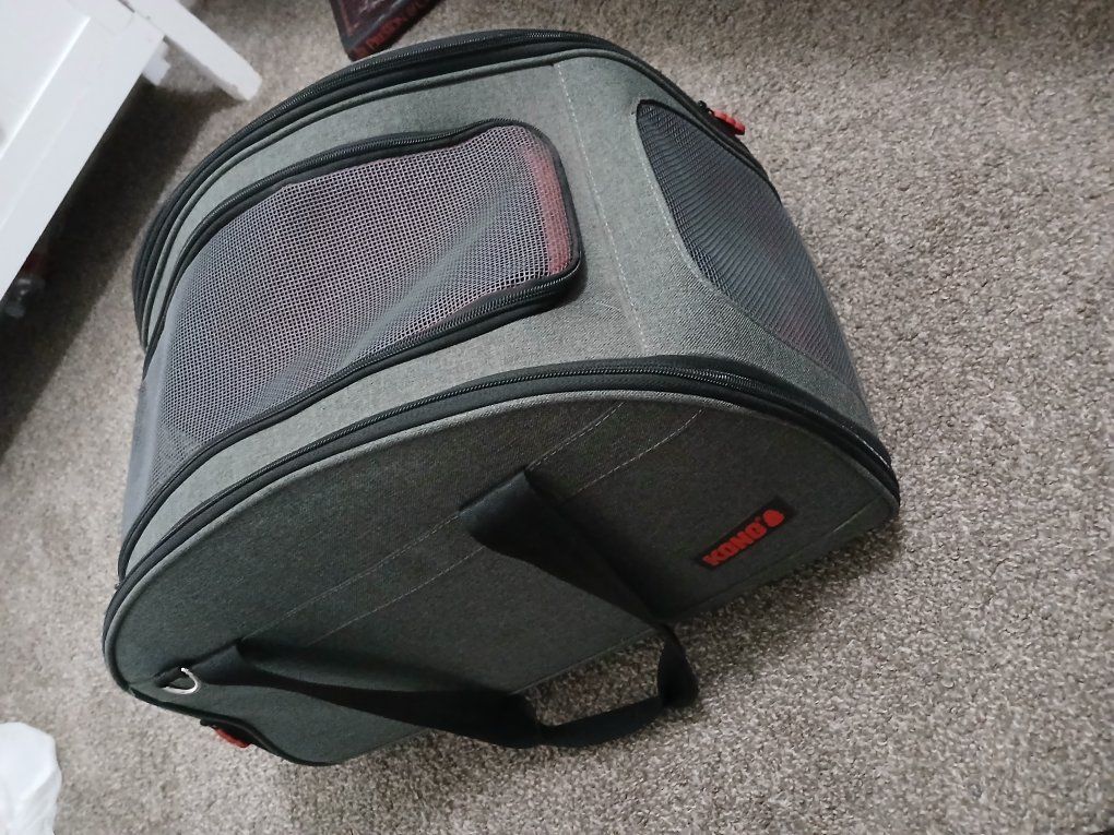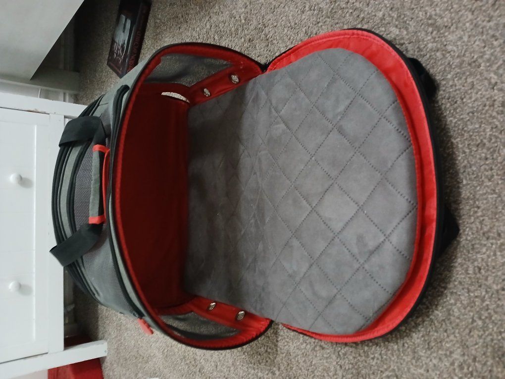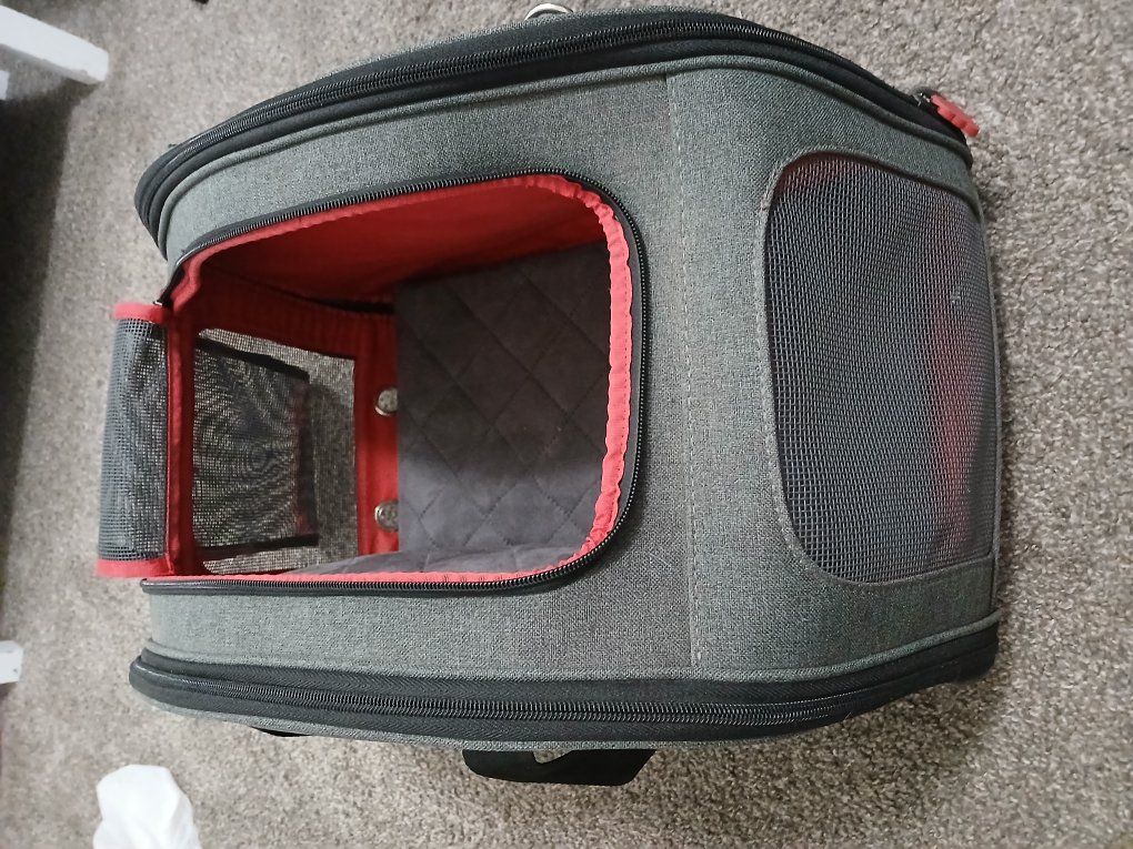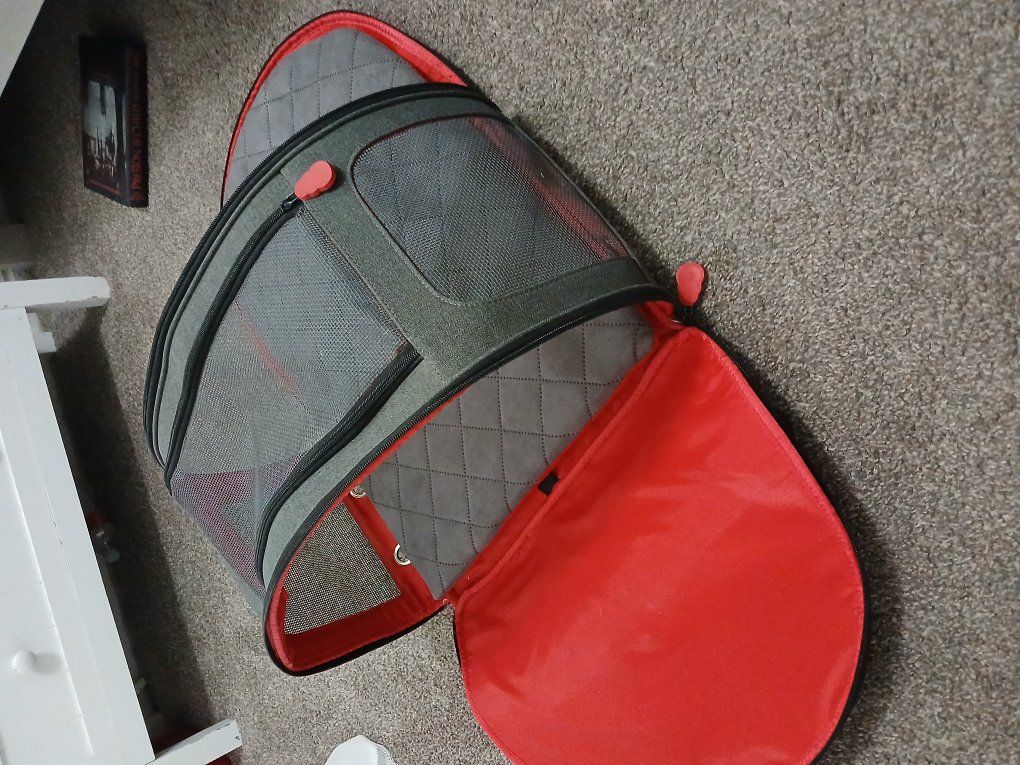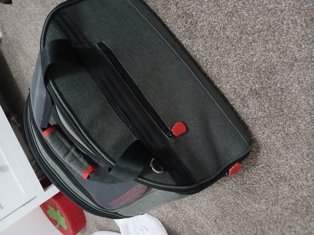 Like new new condition, two in one small animal pet carrier. zips open for a bed on each side, opens up top and has a little zipper pocket on the side for treats or whatever.