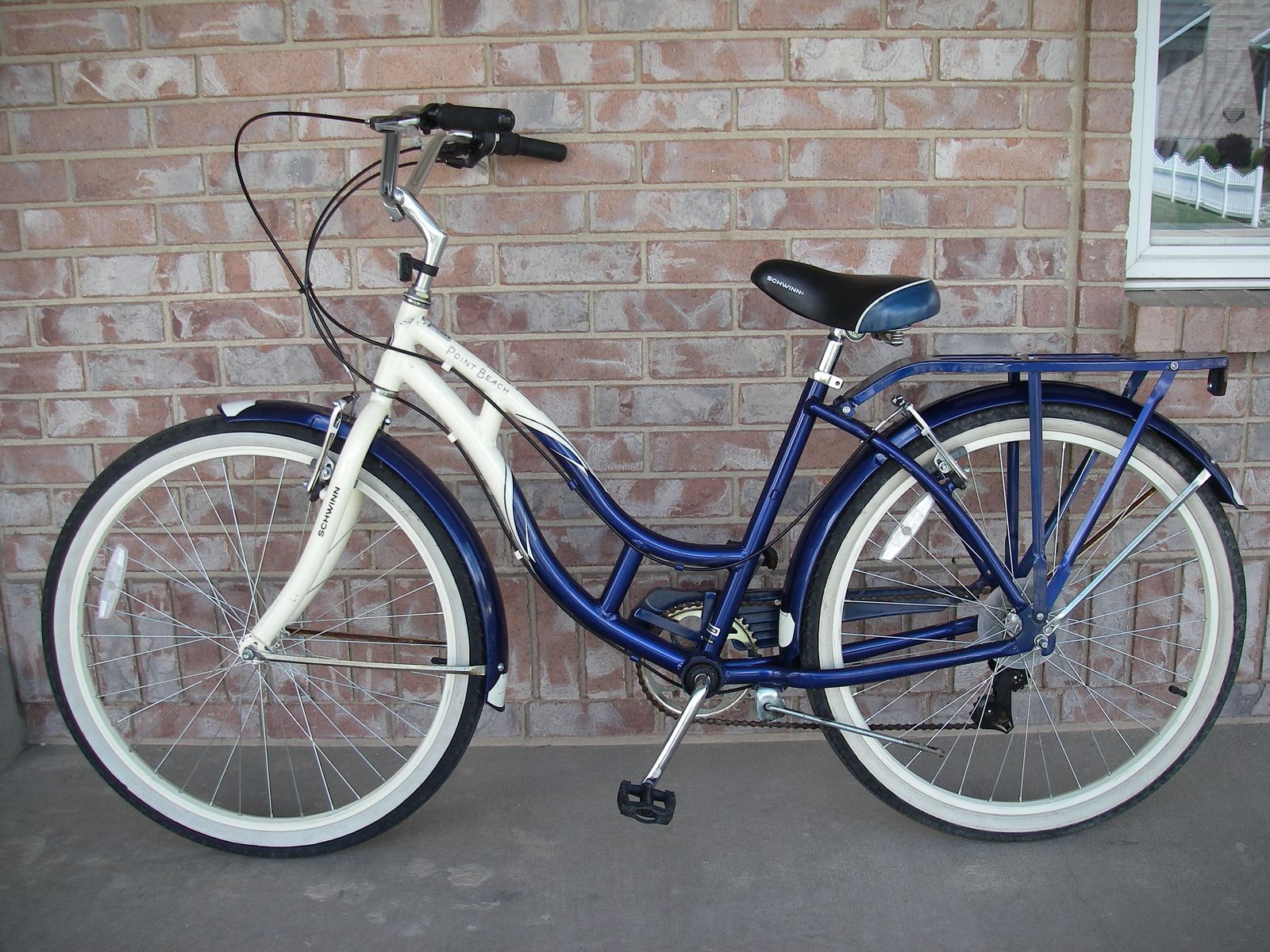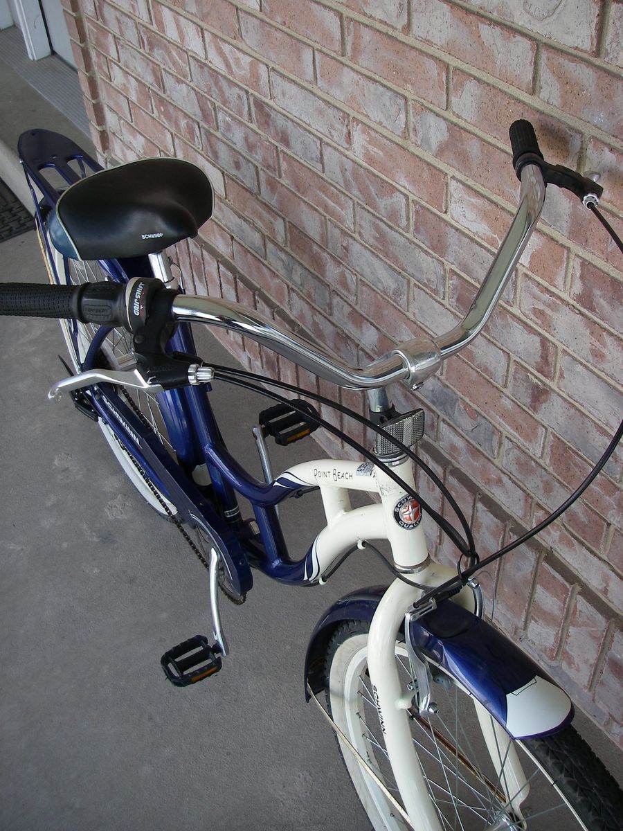 Womens / Girls 26" (wheel size) ALUMINUM frame (Med-Lrg 18"), Schwinn POINT BEACH Retro Style Beach Cruiser Bike, 7-Speed, V-Brakes, w/ Fenders, Blue / Crème.