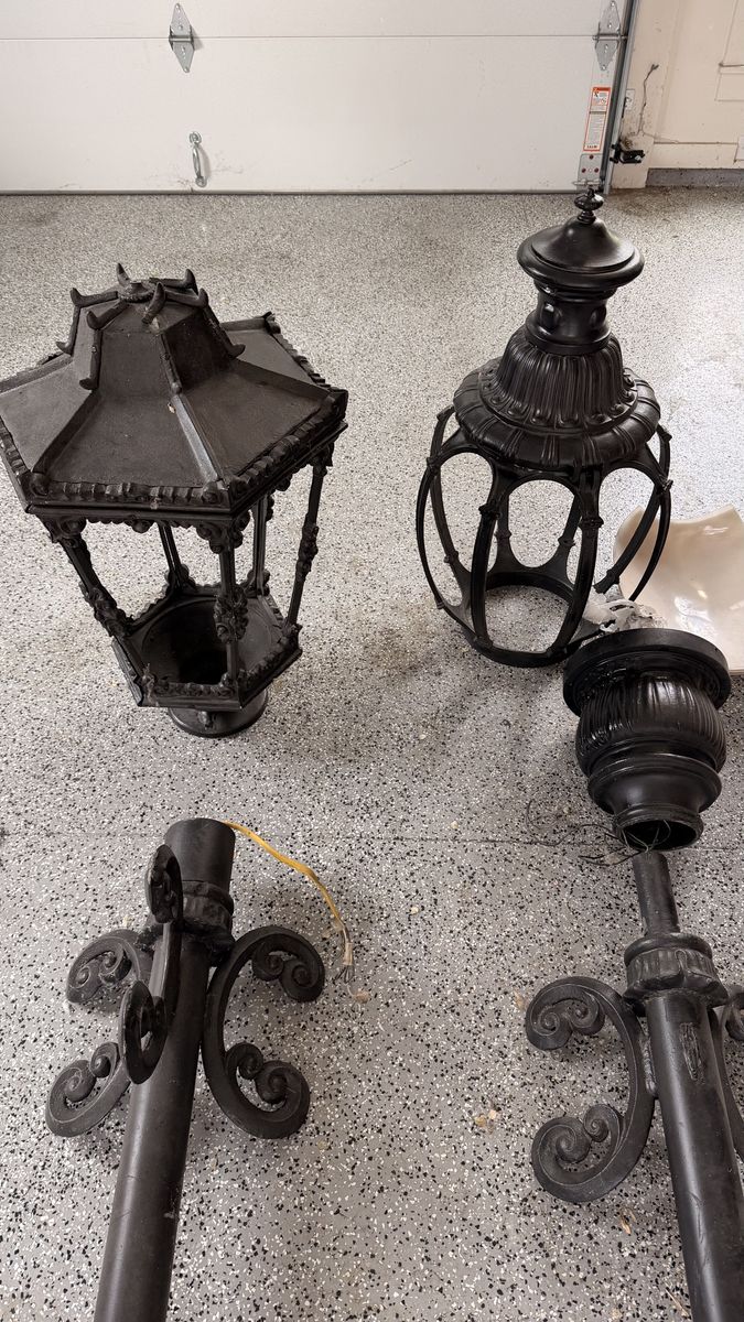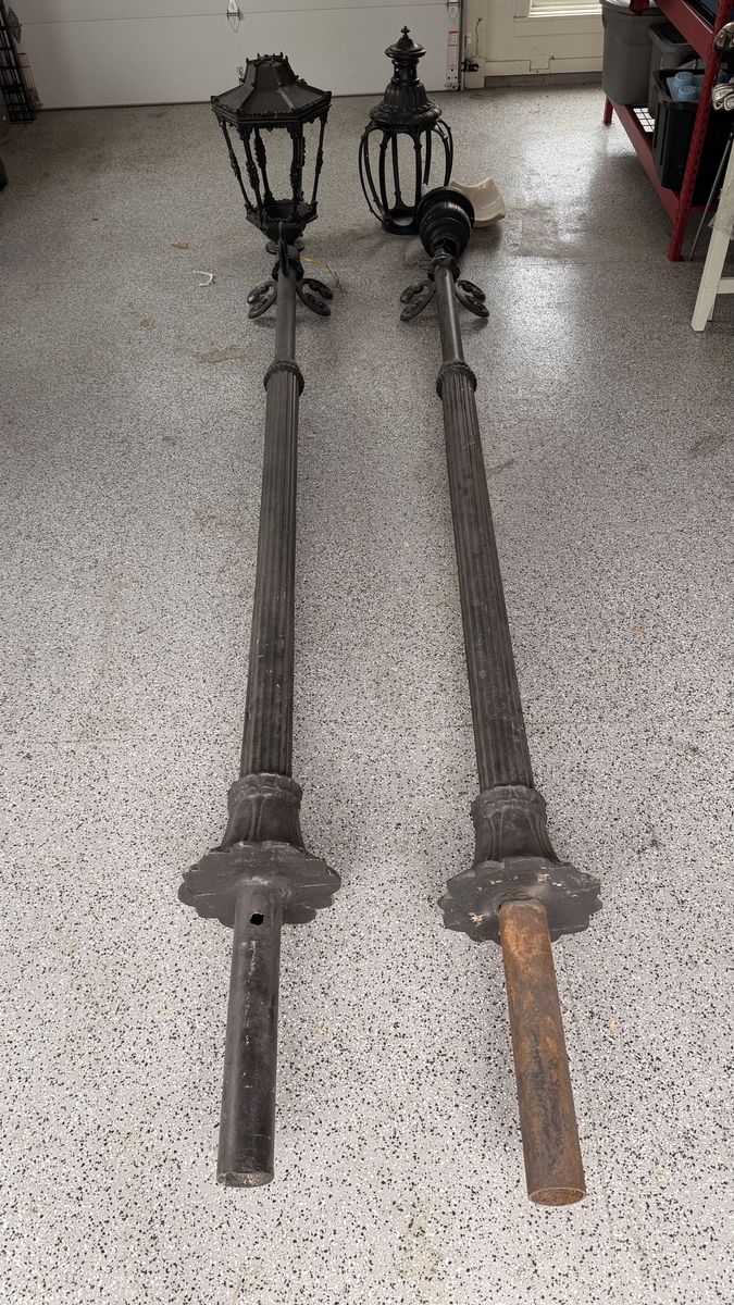 VenmoI have 2 antique cast iron lamp posts. We had 5 and only used 3 when we redid the yard. Powder coated and refurbished 5 years ago and they've been sitting in the garage ever since. About 12 feet tall, heavy and heavy duty. Each one is a different style, but I've included a picture of what they look like once they are installed. Can put high powered LED bulbs in for bright light or a low powered flame LED for ambiance.