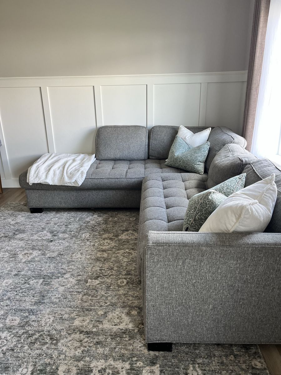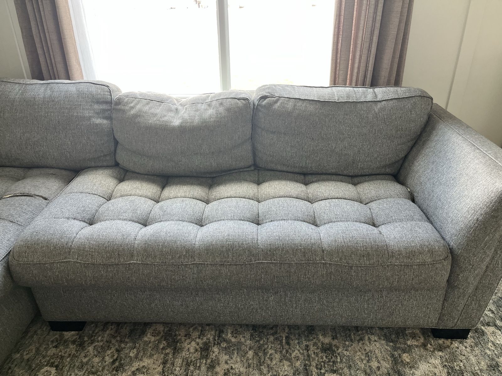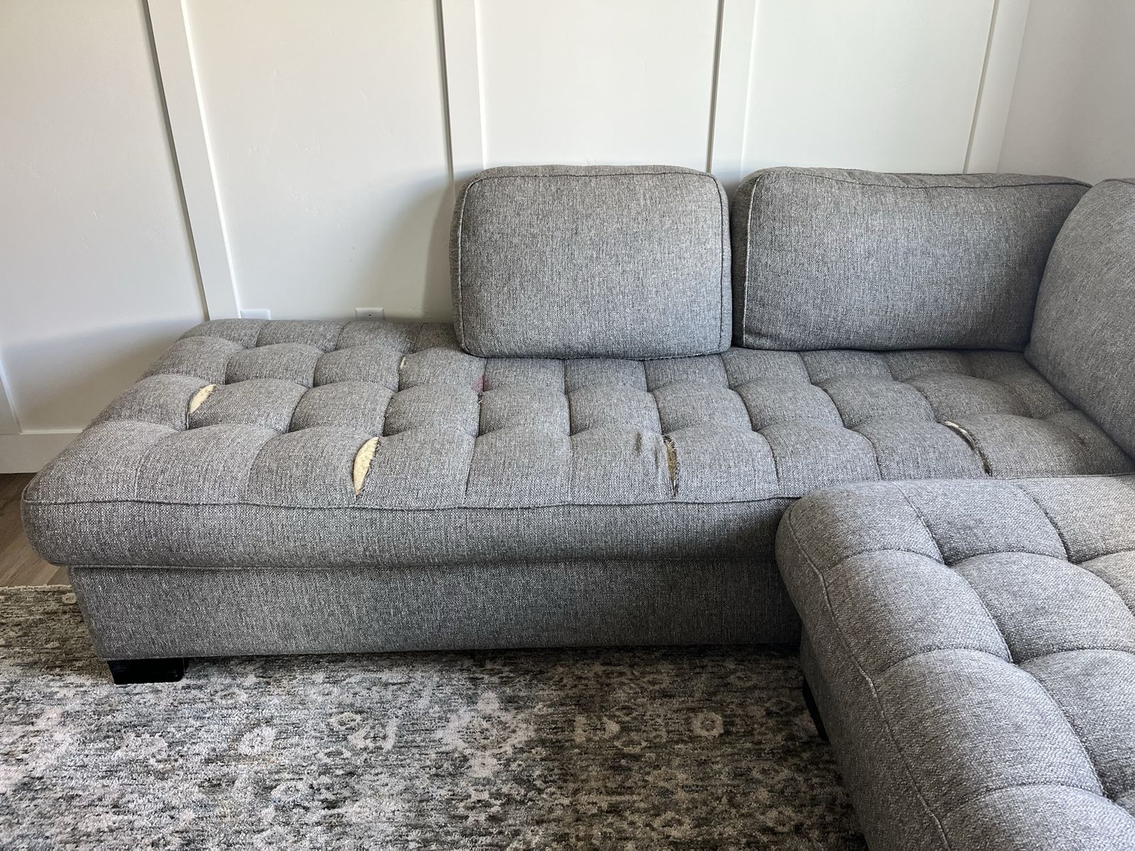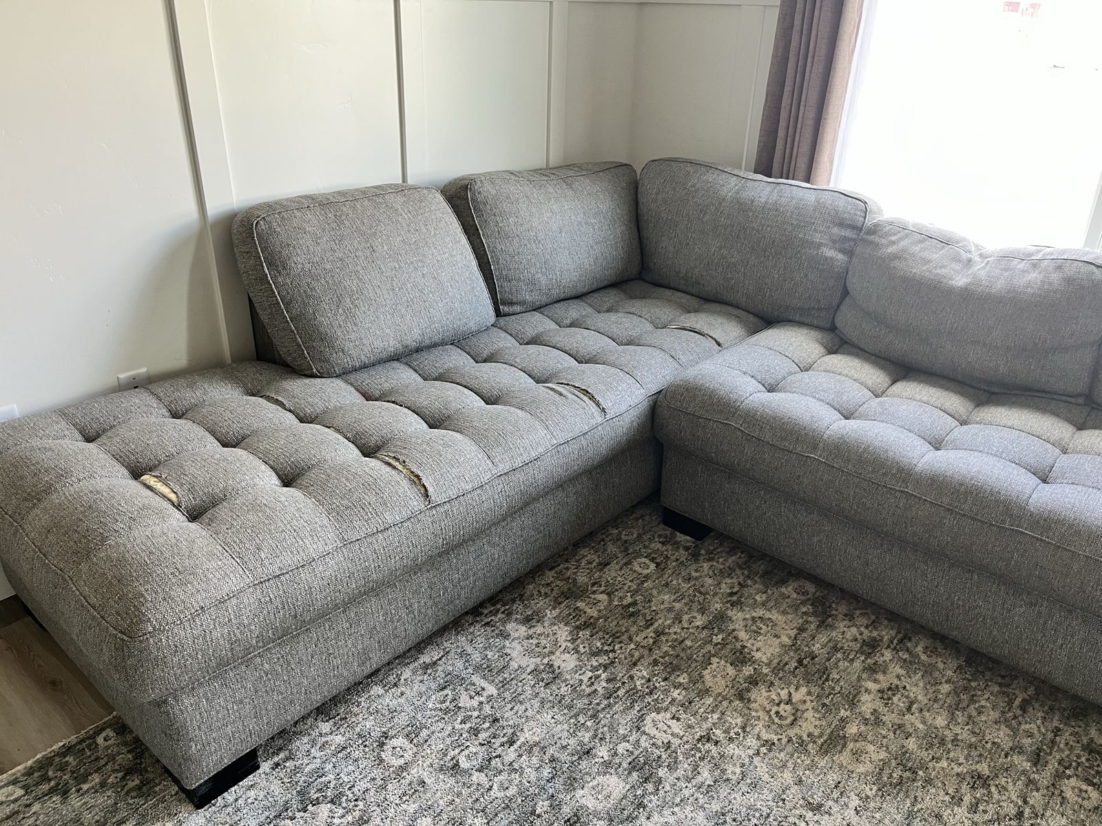 VenmoPretty gray tufted sectional. It has some tears in it and could use a cleaning. *Pillows not included.