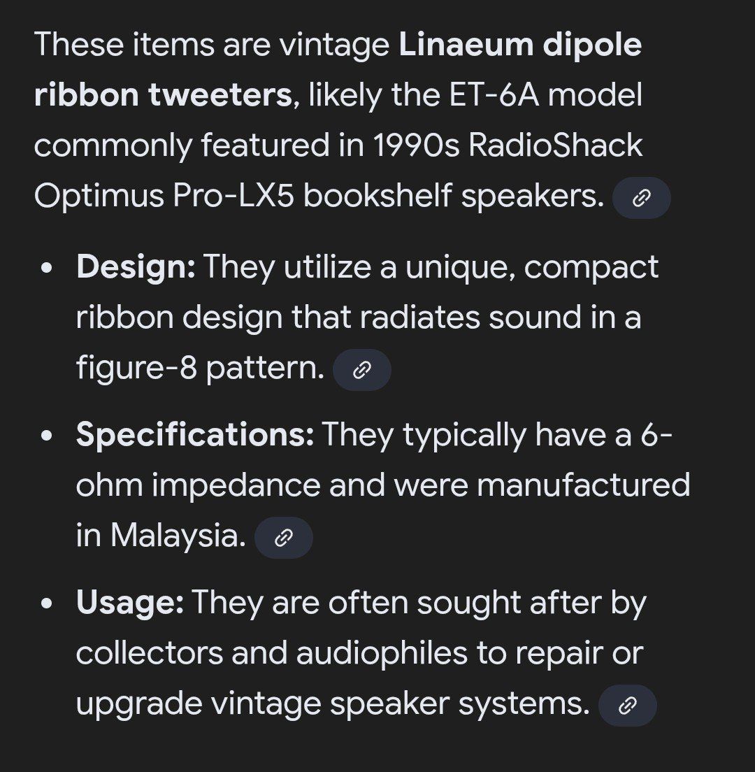 excellent condition Linaeum tweeter set. these sound really good with a figure 8 room filling sound. have covers as well if mounted on top of a speaker. asking only 40 for the set. cash only
