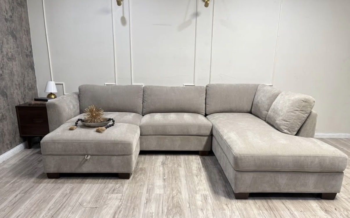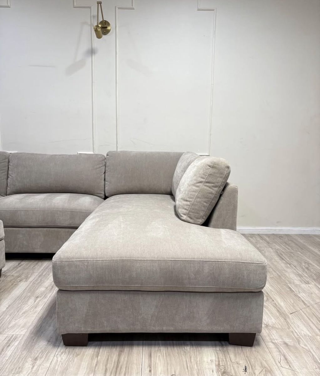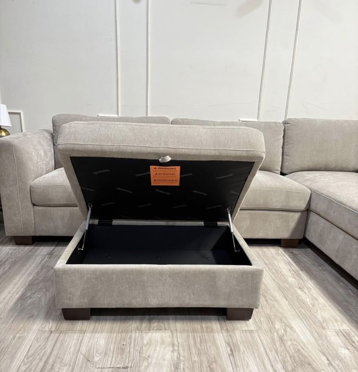 WHY YOU WILL LOVE THIS SECTIONAL... Transform your living room with the Thomasville Walsen Sectional Chaise with Storage Ottoman. Luxurious, soft polyester fabric and firm seat cushions offer the perfect blend of comfort and support. The modern track arm and solid wood tapered legs add a touch of elegance, while the lounging chaise and storage ottoman provide unmatched versatility. With two stylish accent pillows and practical attached cushions, this sectional is designed for both beauty and functionality. Enjoy ultimate relaxation and chic style with Thomasville.