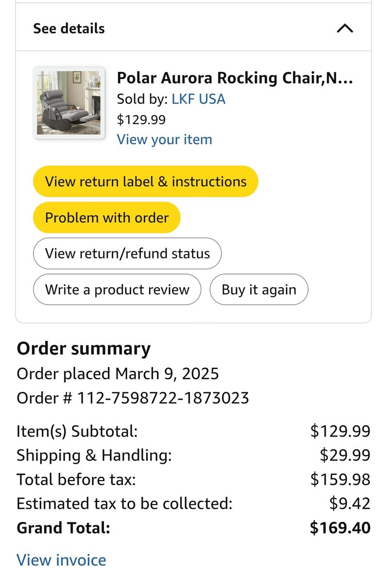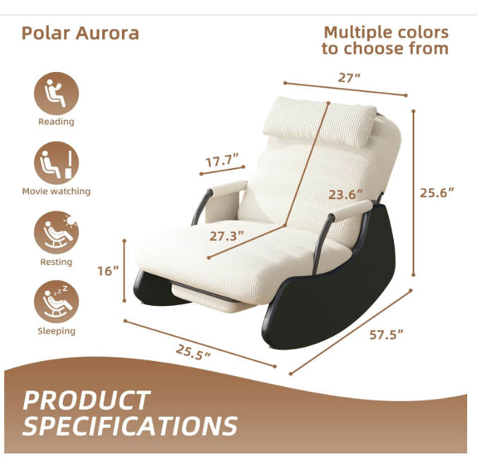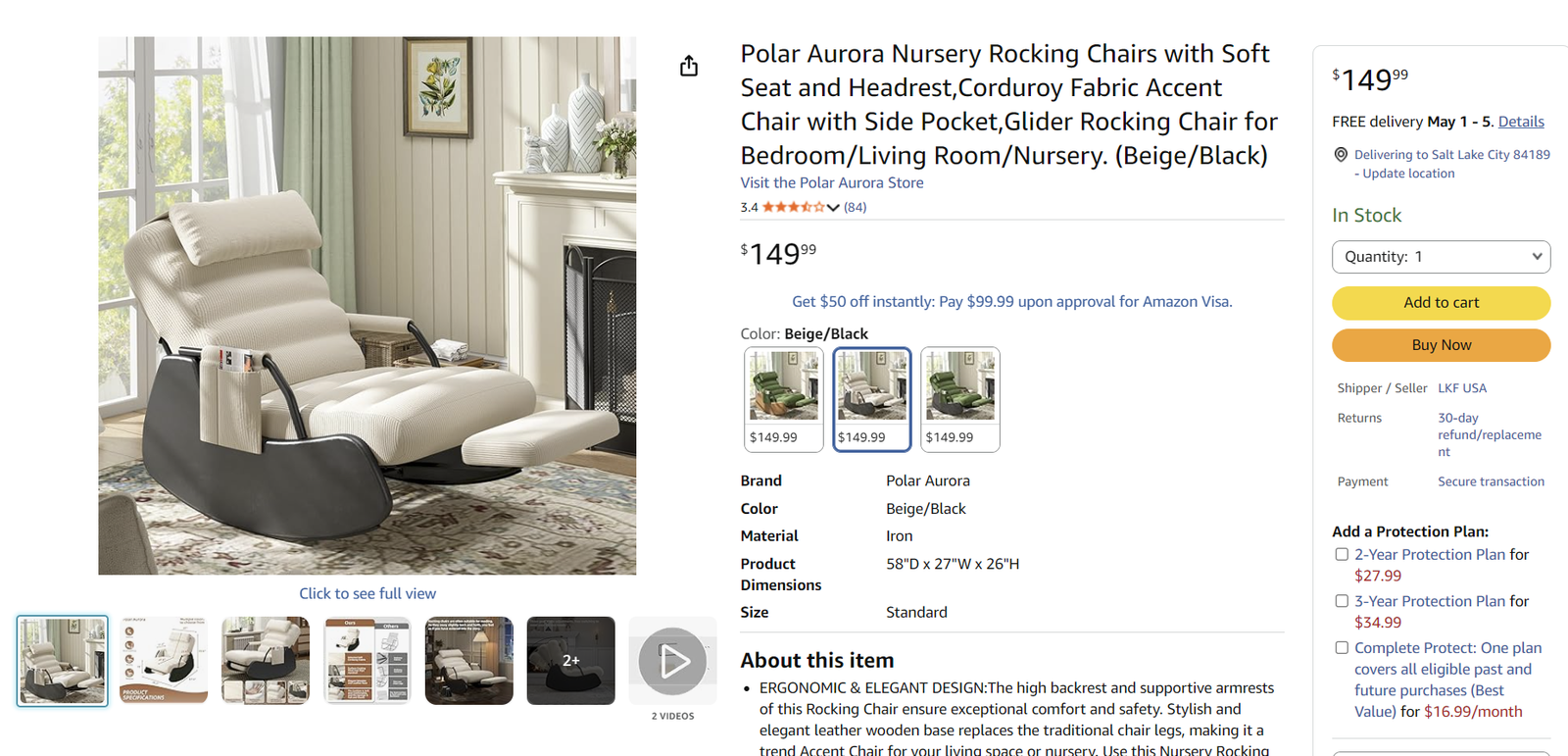 New nursery chair still in the box for sale. We purchased the chair off of Amazon. Before we removed it from the box, we realized it would not fit where we were going to put it. Shipping was too expensive to return it. We paid $169.40. The color is black on the sides and grey cushions. $100.00.