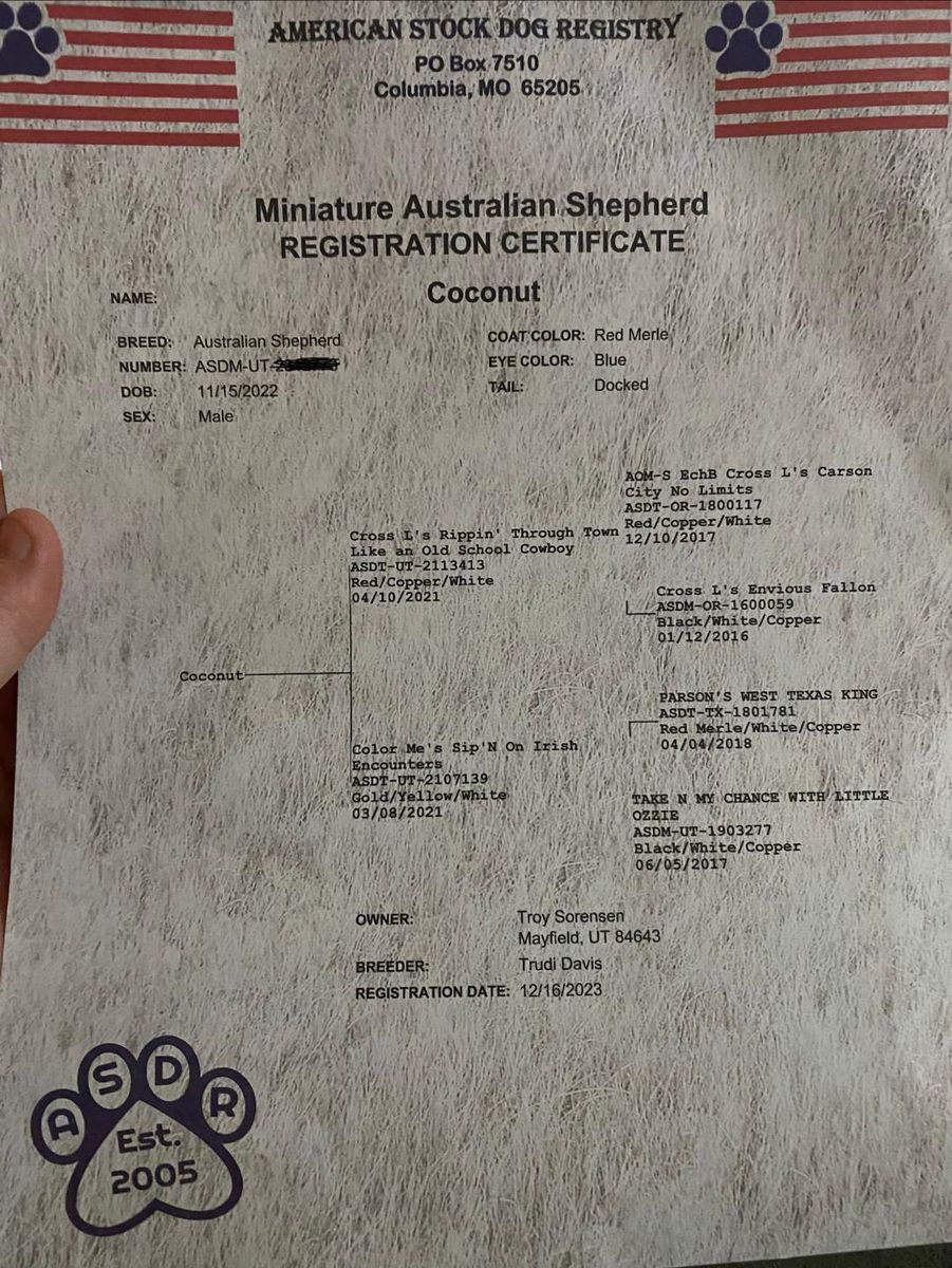 Venmo3-year-old purebred Mini Australian Shepherd (papered with ASDR). He has striking blue eyes and has been bred once, producing a litter of 6 puppies—all with blue eyes.