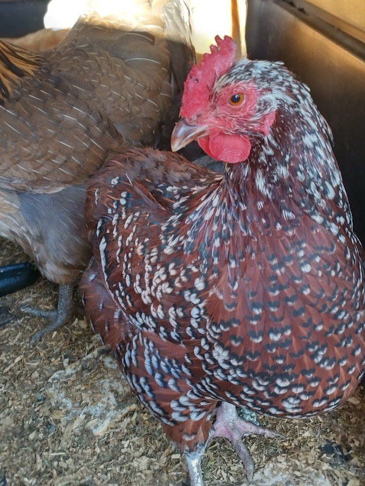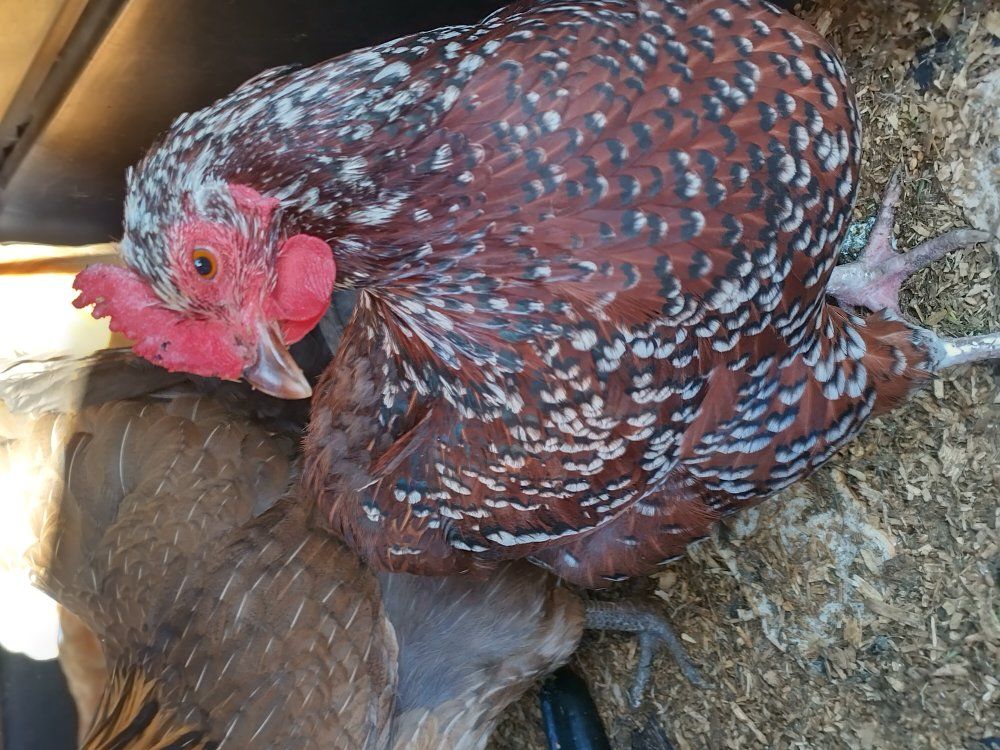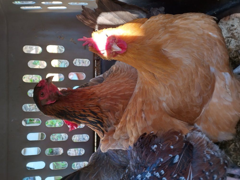 4 two year old hens not really laying much 1 yellow Orpington 1 Cream Legbar 1 I'm not sure the breed 1 Speckled Sussex