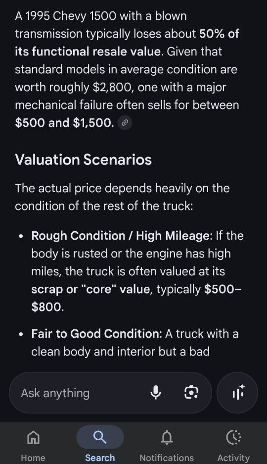 VenmoThis truck runs amazing starts every its fuel inject has great interior. It's only been used for a feed truck. It's all life. But now the transmission went out on me it's got all good tires. And 4 high and 4 low work as well as 2 high it's got a spotlight, and all the windows are good. Except for the windshield has some rock chips in it. I'm asking 800 obo and i'm will for 3 wheelers dirt bikes other trucks and whatever else you got shoot me a message. The worst I could say is no I'm