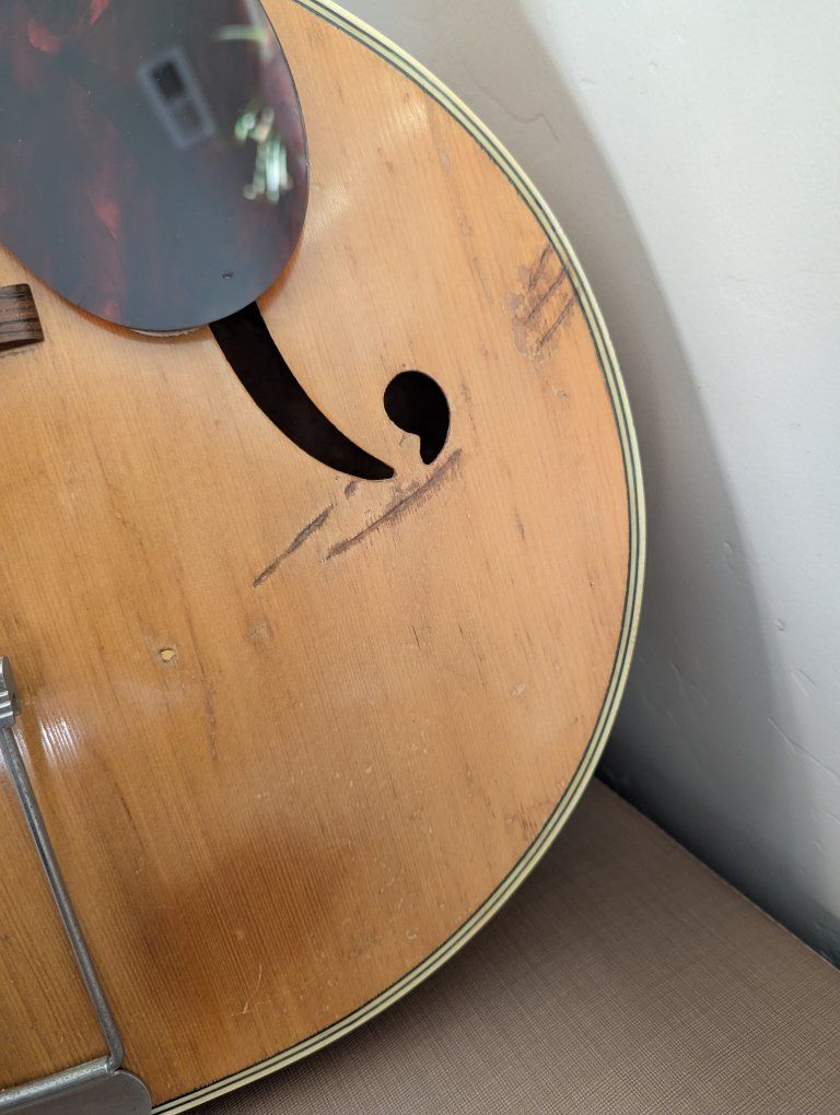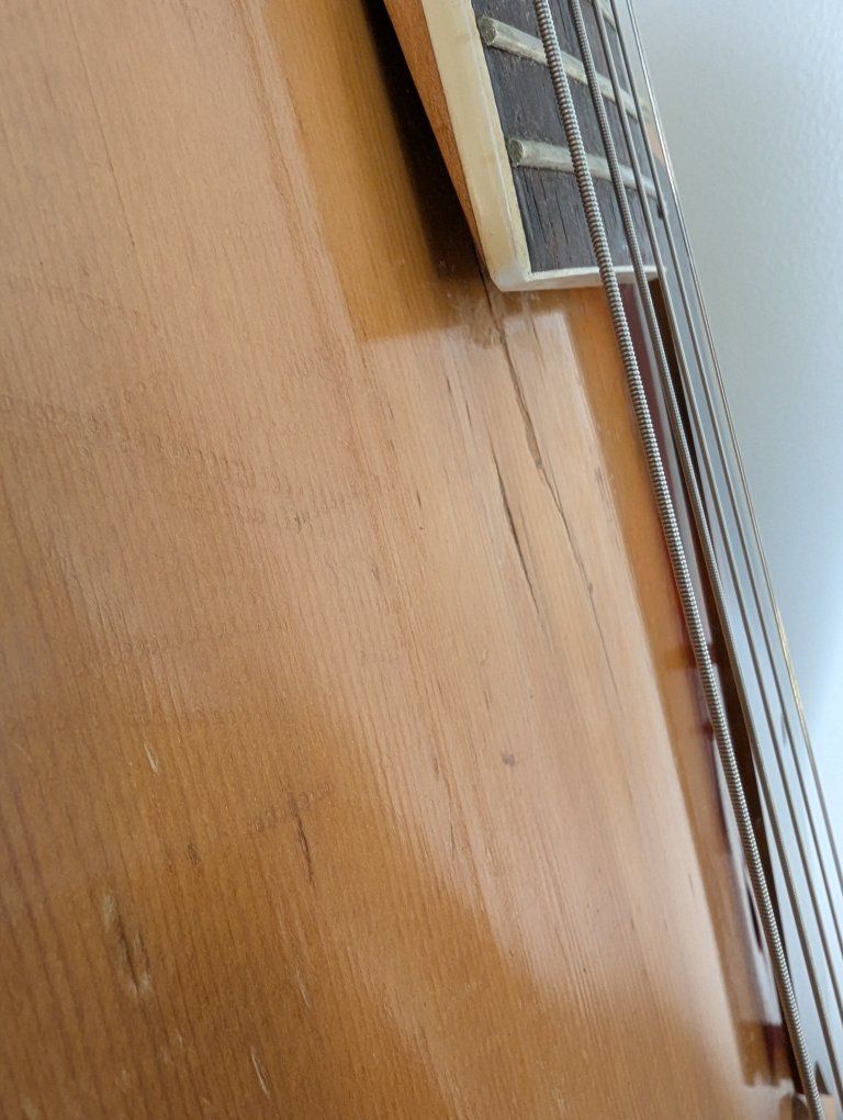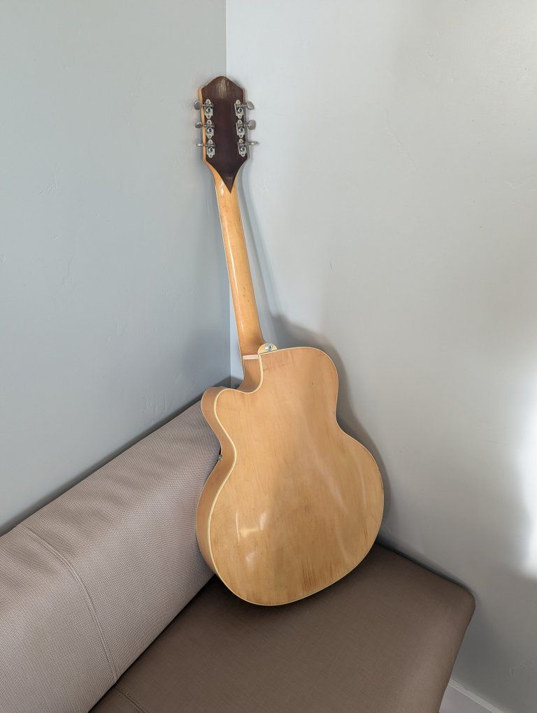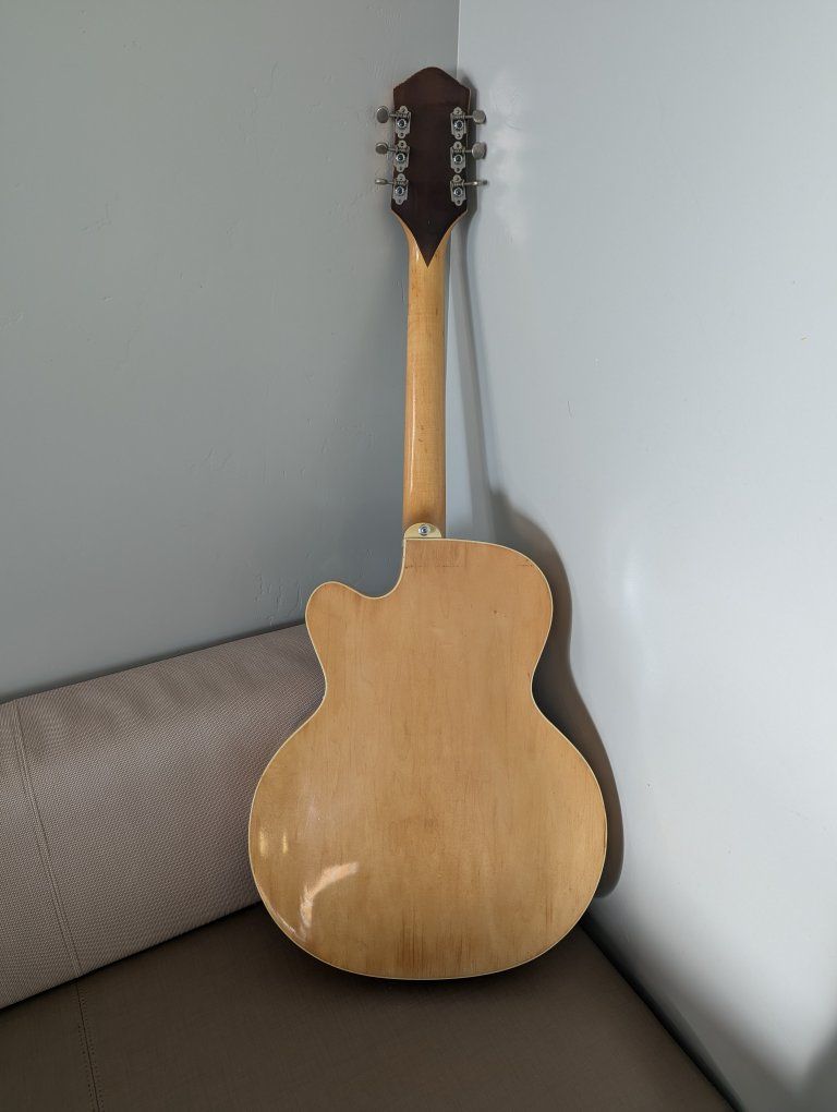 For its age it's in decent condition. These were sold with a solid spruce top, solid maple back and sides, solid maple neck, and a brazilian rosewood fretboard and bridge. It needs a little TLC and a good setup by someone who knows what they're doing. It plays really well with a pretty low action and no buzz. It is almost all original except for the pickguard. The truss rod is fully functional. It has a small crack under the fingerboard extension that looks like it has been repaired at some point. , The truss rod needs some tweaking because there's a subtle back bow. The frets definitely need work. They are flat and have been played quite a bit. There is other wear and tear that is just cool patina. There are some marks on the front that are dark but you can't even feel them. Come try it out. It's a really cool old guitar! May consider trades.
