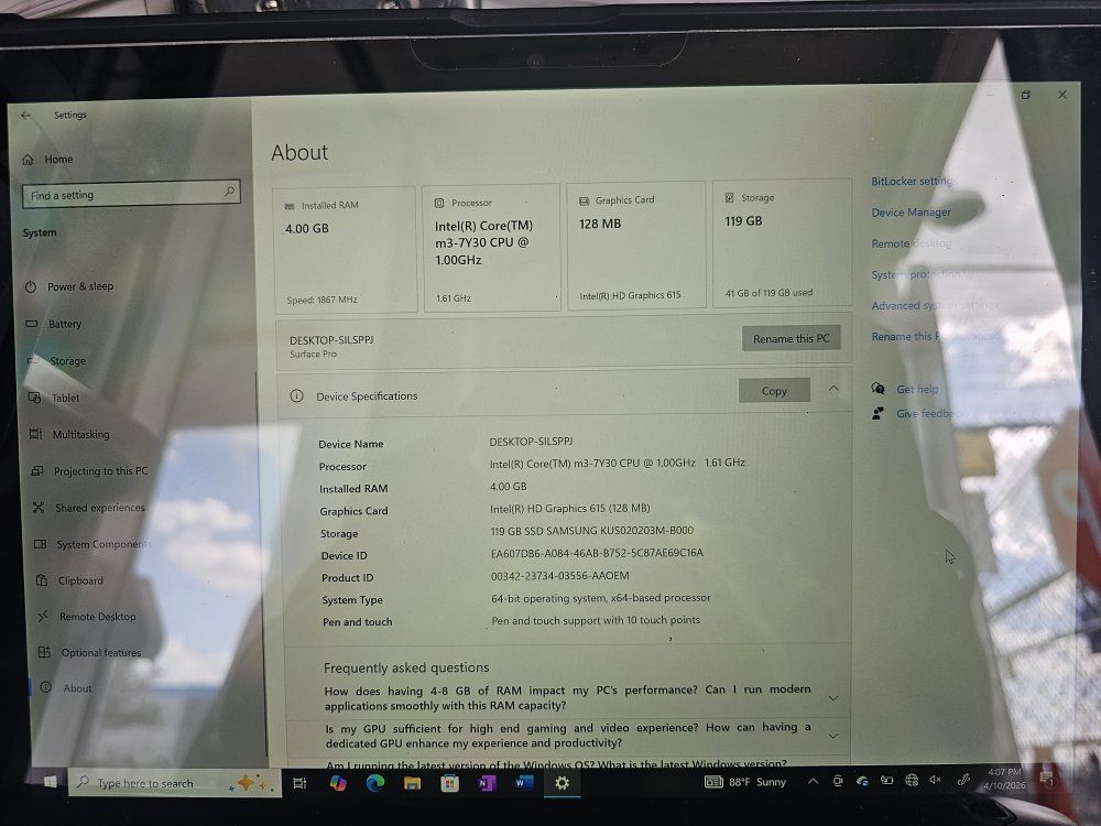 Price is firm Set only 128GB storage, Pro 1, Windows 10. Has been reset. No damage, holds charge plugged & unplugged, has a screen protector on it. Comes with: Charger, Hard Case, Removable Backlit Keyboard, Bluetooth Mouse & Soft Carrying Case.