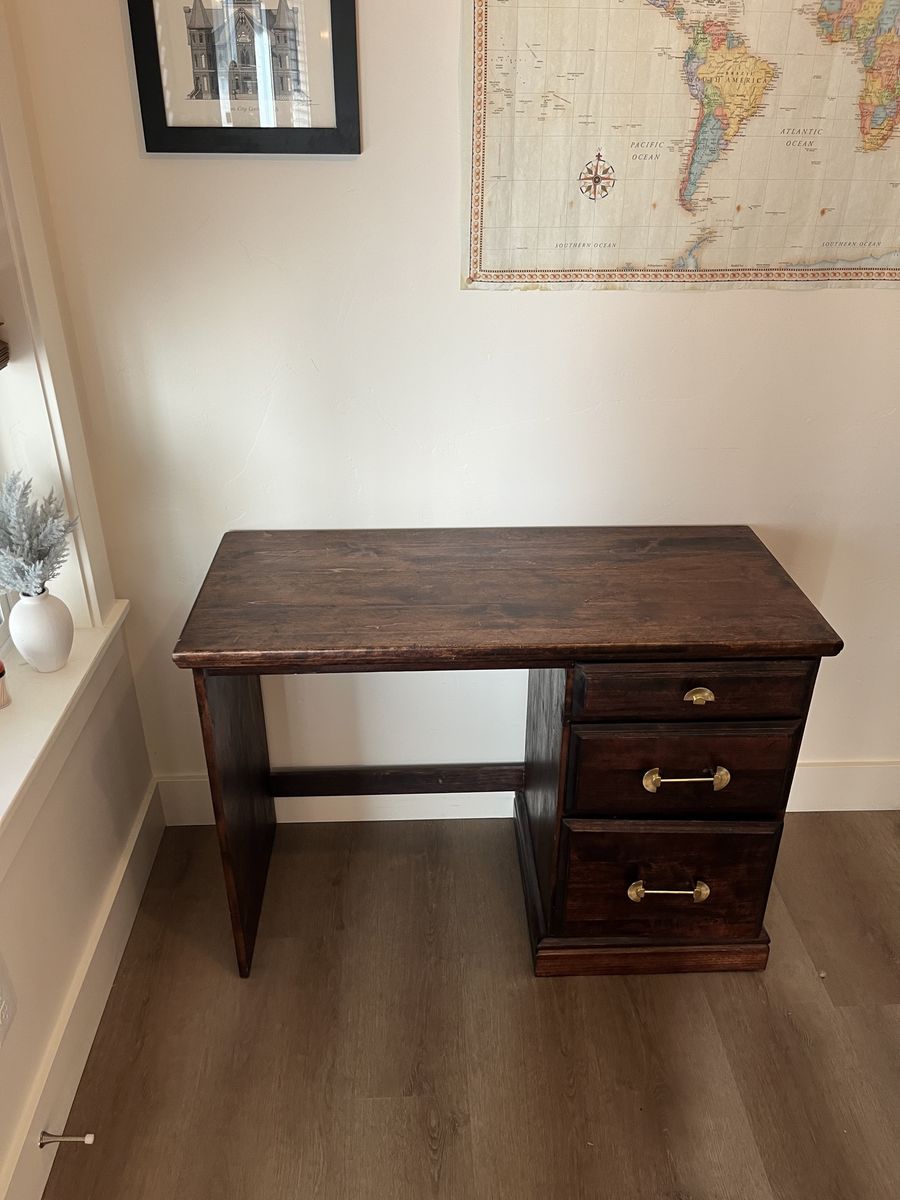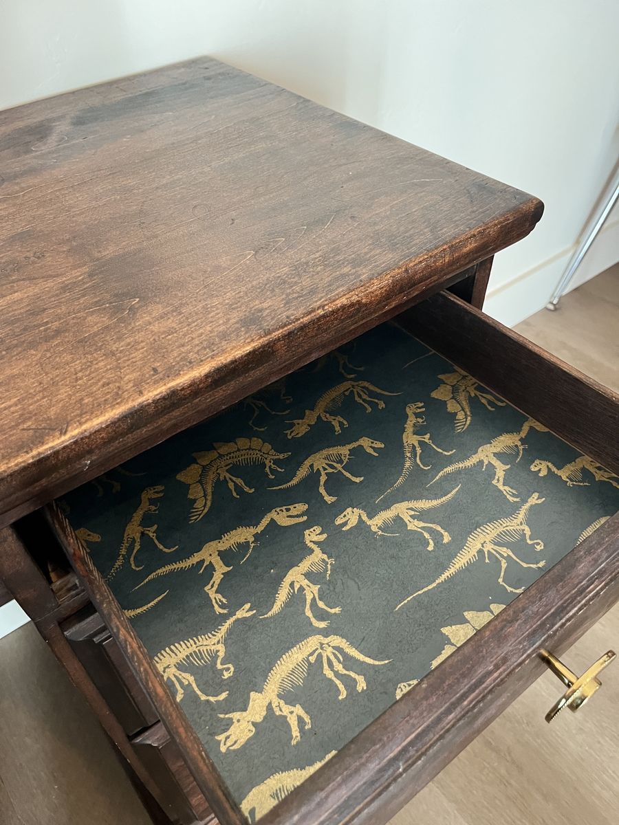 Used as a vanity with a mirror, but it could also just be a desk. The drawers are lined with Dinosaur teal and gold paper with a protective cover for easy cleaning. Solid brass handles.