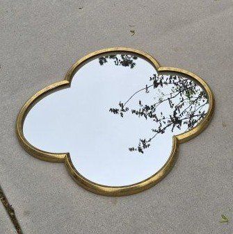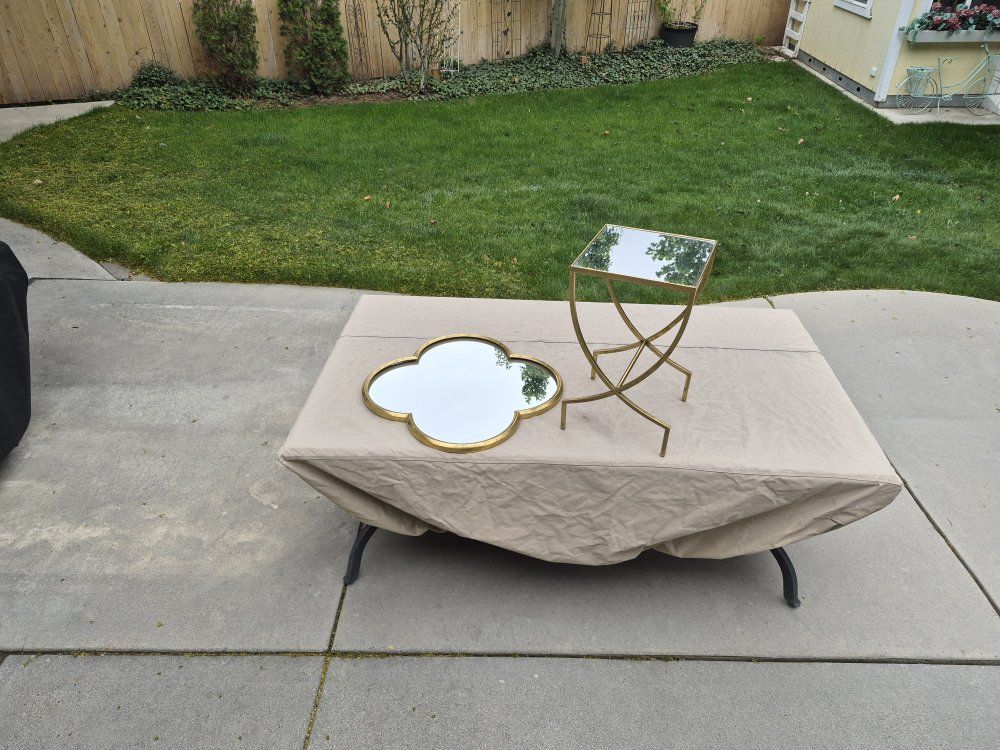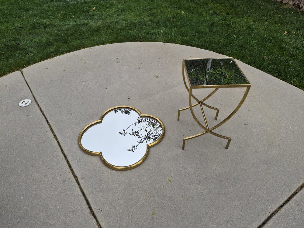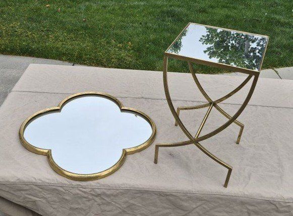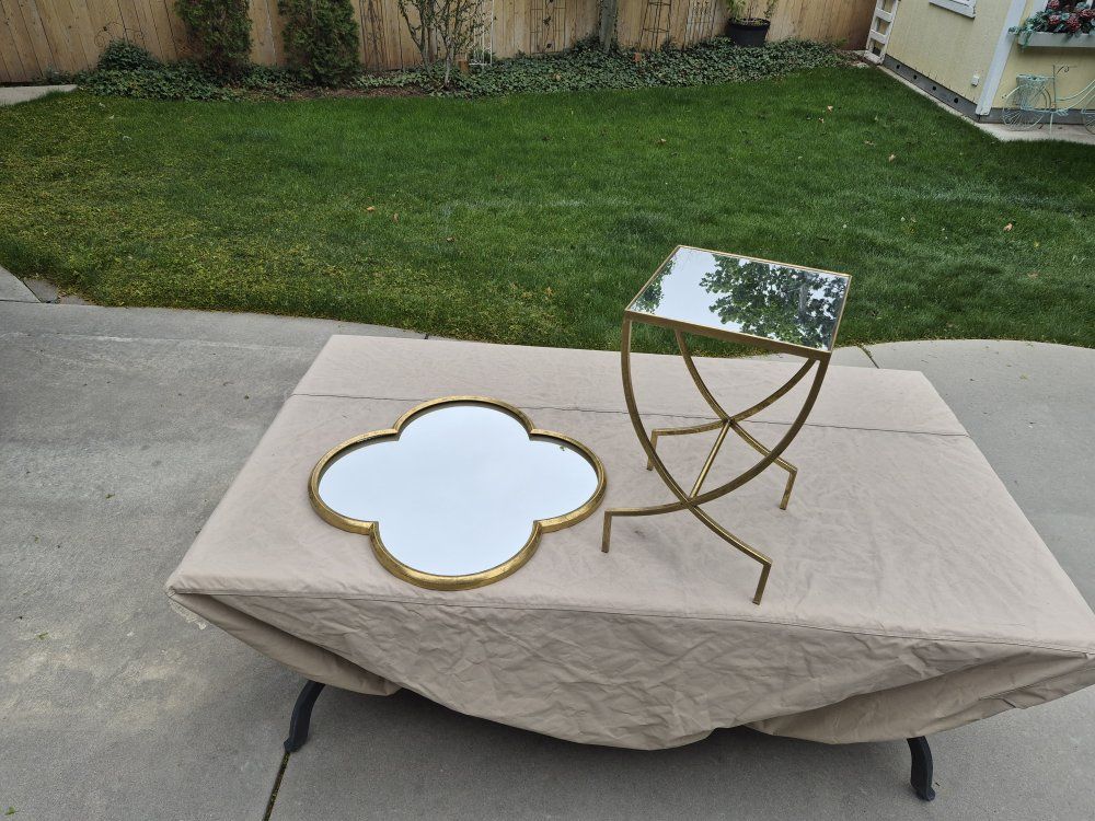 1 clover mirror with gold metal frame. 1 side table with gold metal stand and mirror top.
