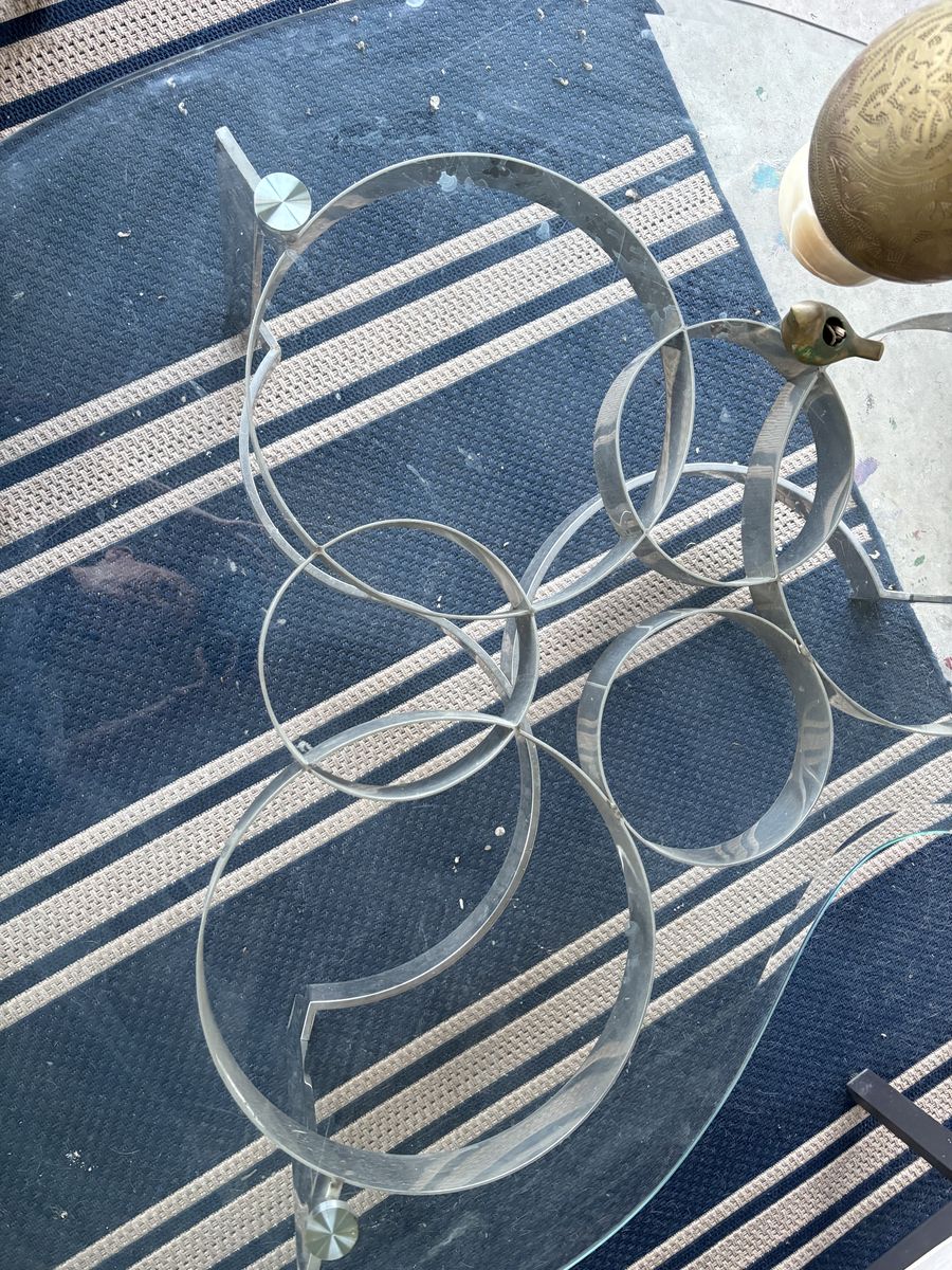 No damage to the glass or frame. We used it outside, but you could use it inside as well. I haven't cleaned it in the picture, it looks very nice when cleaned. I'll send a picture of it clean upon request