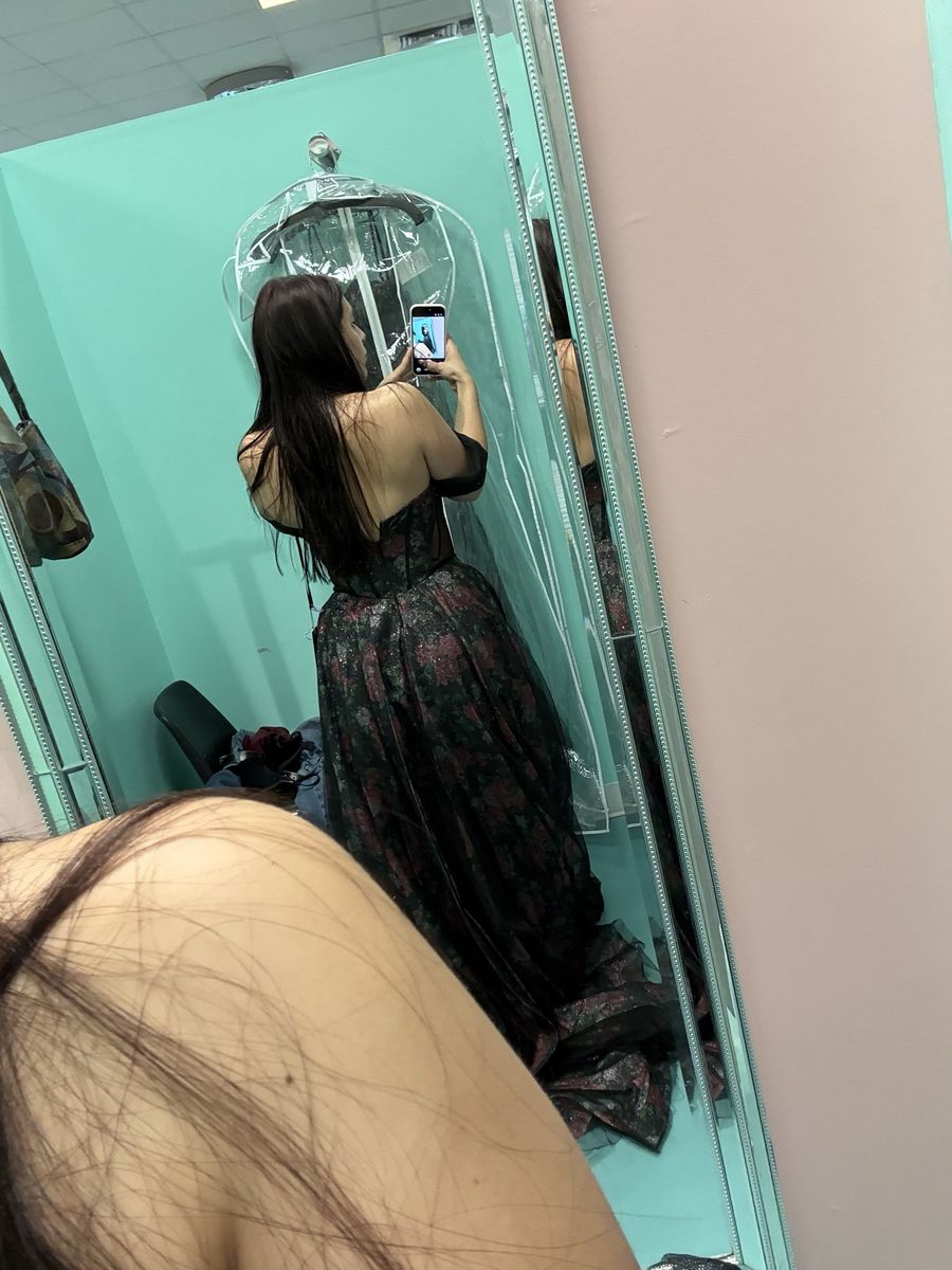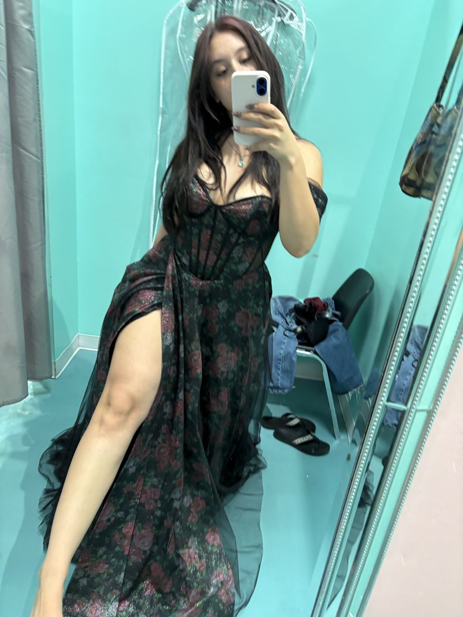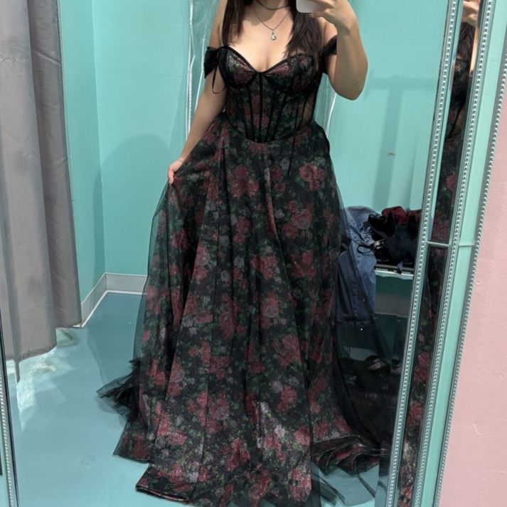 Venmosize 6- Black, Pink, & Green floral prom dress with mesh overlay.