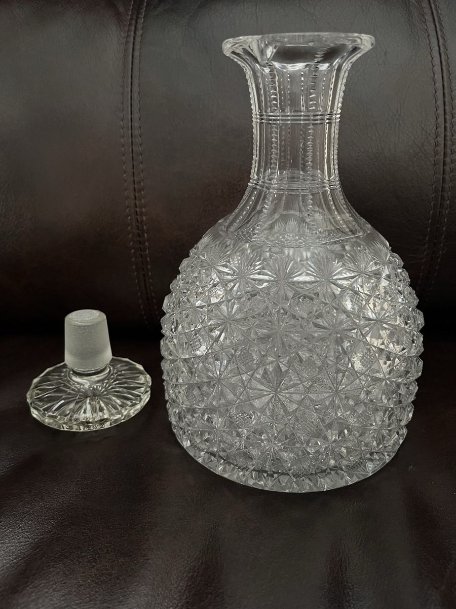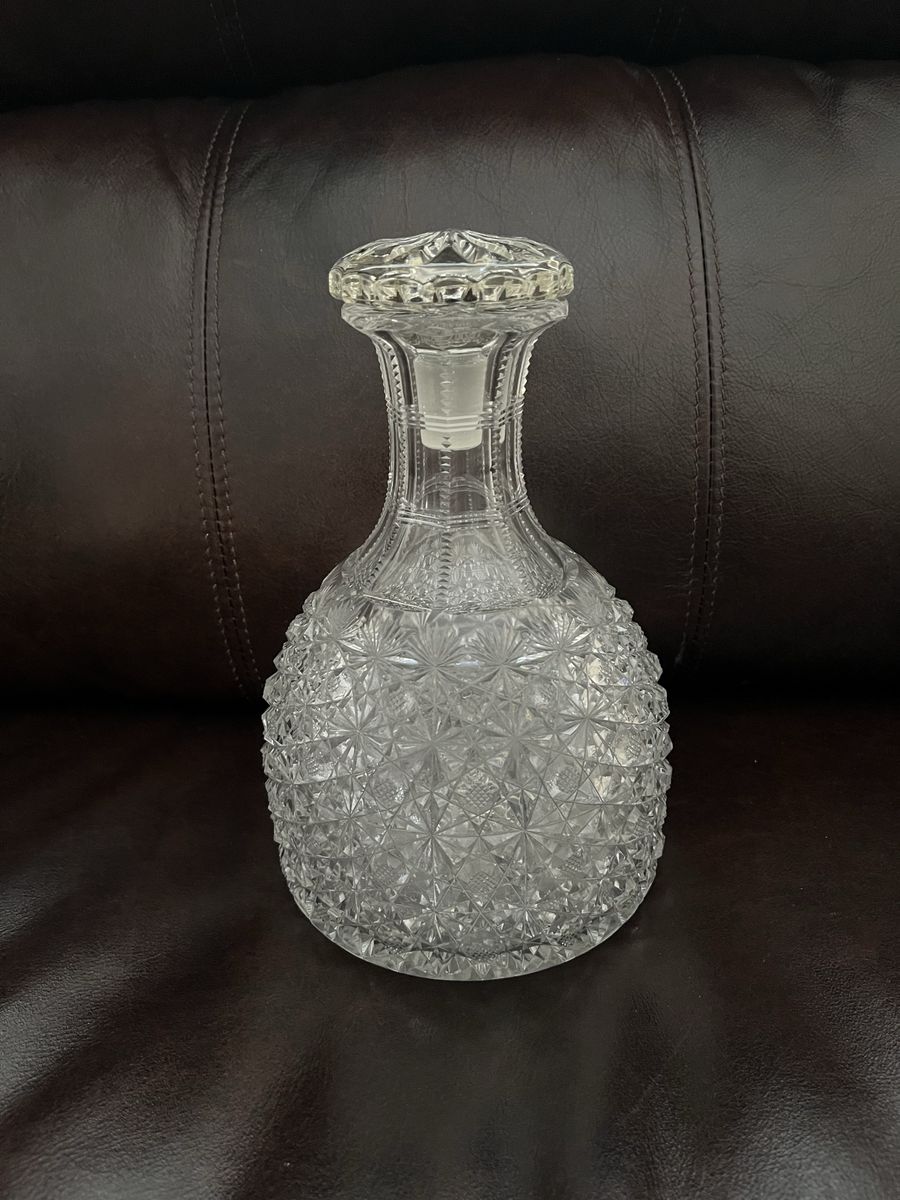 VenmoFor the person who is hard to buy for, or the person who has everything. This is such a find, to find a decanter with a stopper. This measures 8 inches tall x 5 1/2 inches wide. It is a heavy piece. I believe it was made between 1880-to the 1920's. It has a very detailed and intricate cut design in the crystal glass. There are Hobstars, fans, and diamond shapes. The neck has the zippered look. There is one tiny flea bite on the stopper and one small chip on the underside of the top rim on the decanter. With the stopper in, you can not see it. I will not ship this. Selling for a parent, so the price is firm.