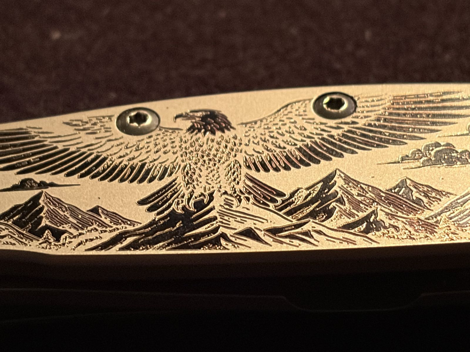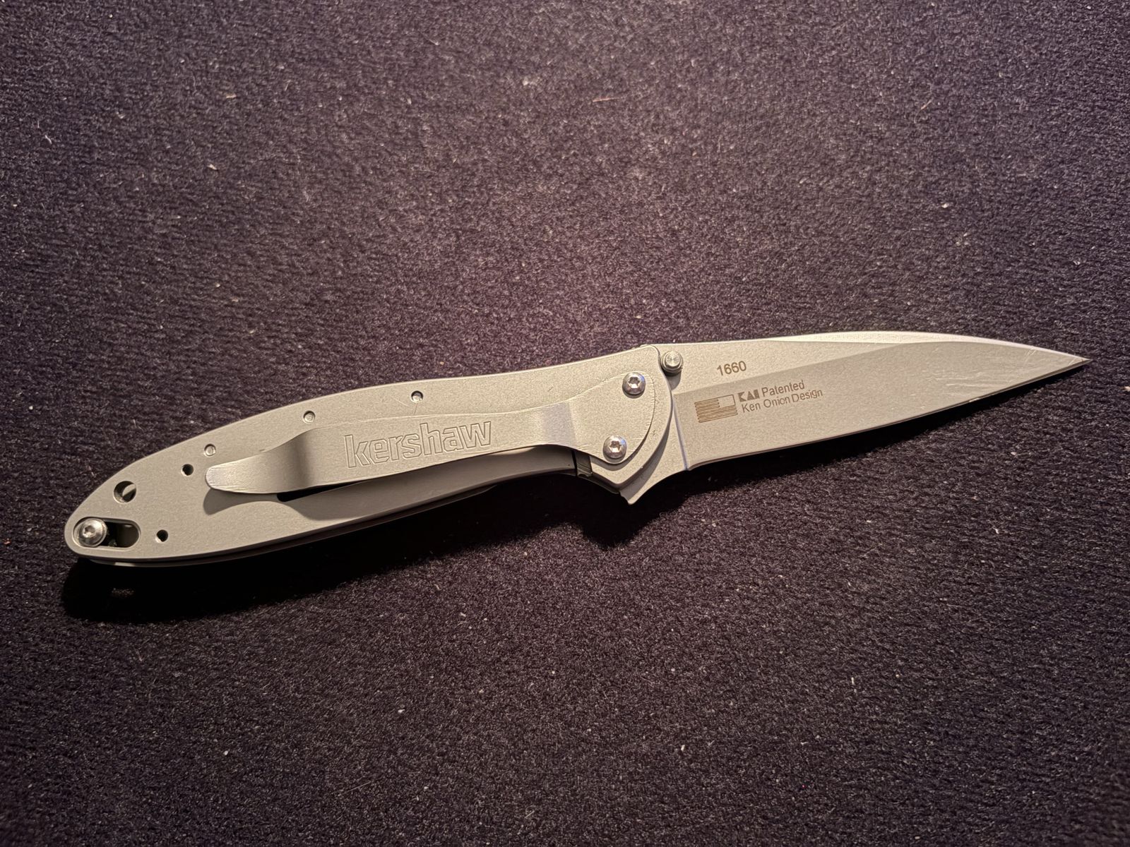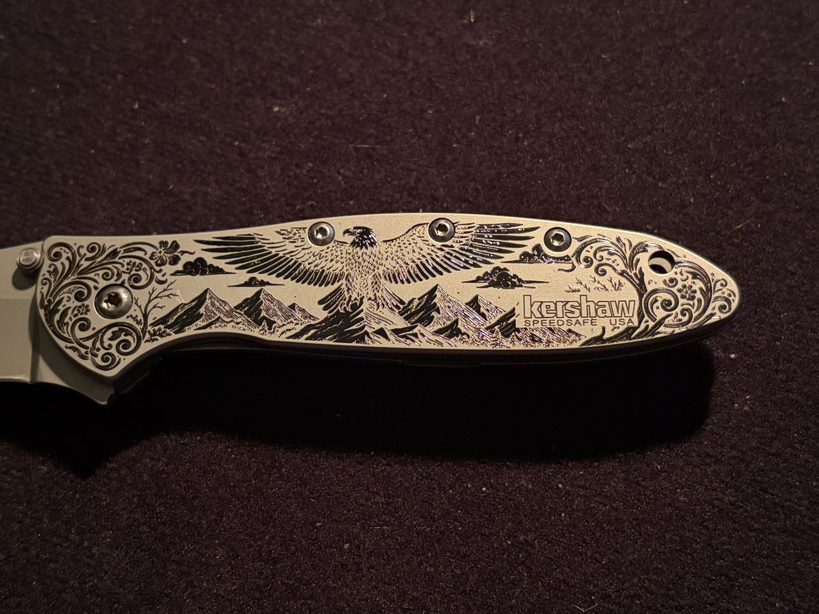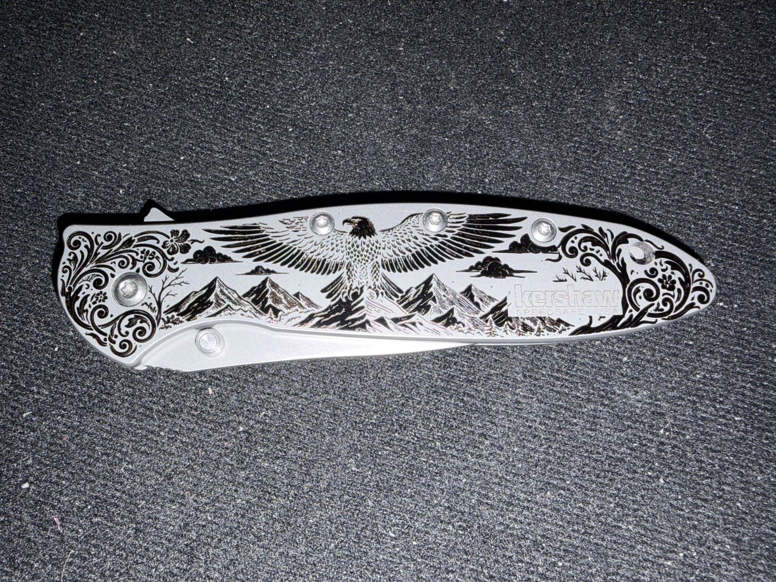 VenmoUp for sale is a Kershaw Leek (model 1660), the iconic Ken Onion / KAI design with SpeedSafe assisted opening. This one stands out — it features a stunning laser-engraved handle with a detailed bald eagle in flight over a mountain range, surrounded by ornate floral scrollwork. The engraving covers only one side of the knife. Specs:\