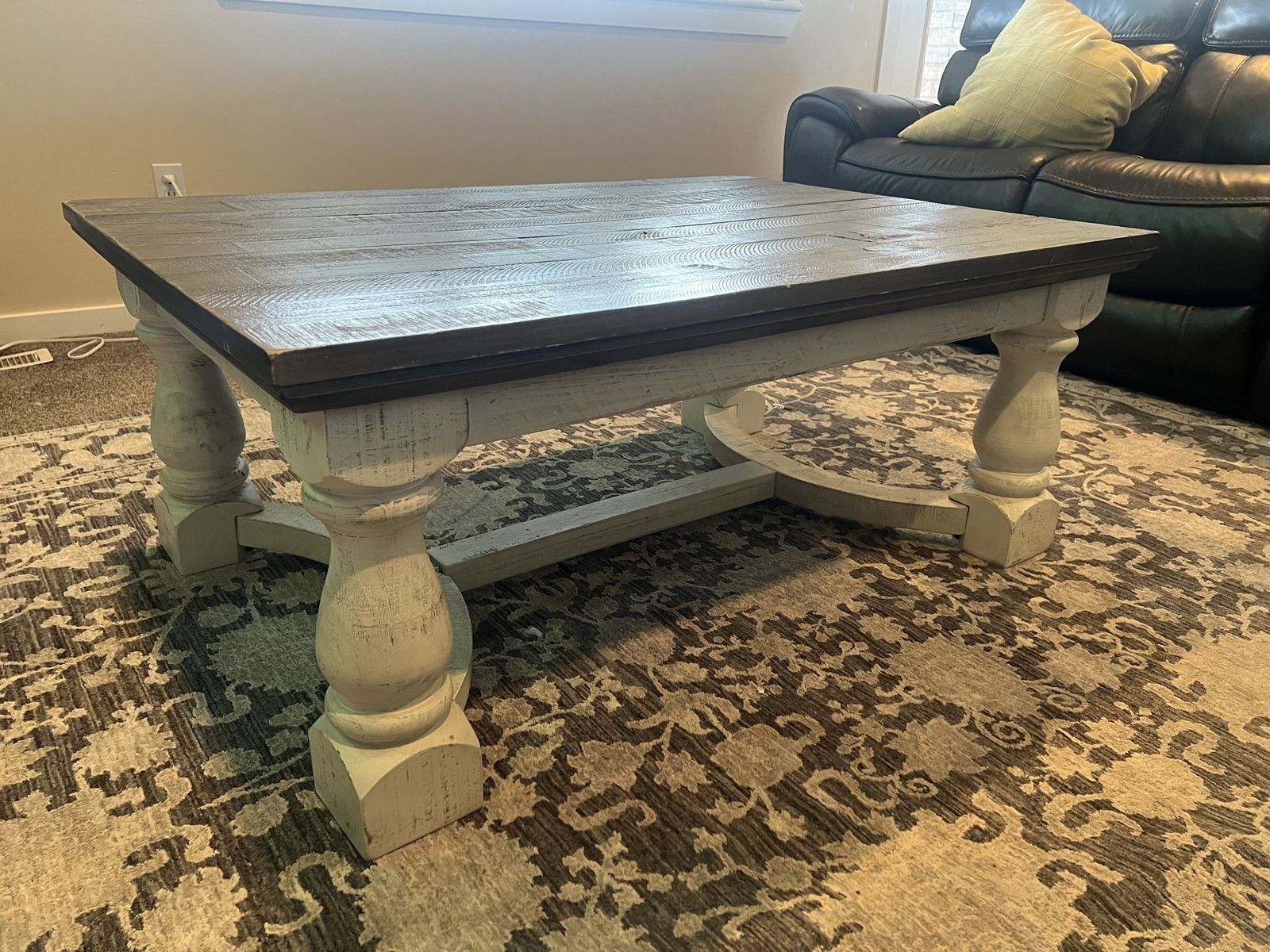 VenmoRustic farmhouse matching coffee and side table. Normal wear. Price is for both. Coffee table is 46”x32” Side table is 26”x24” Cash or Venmo only. Must pickup.