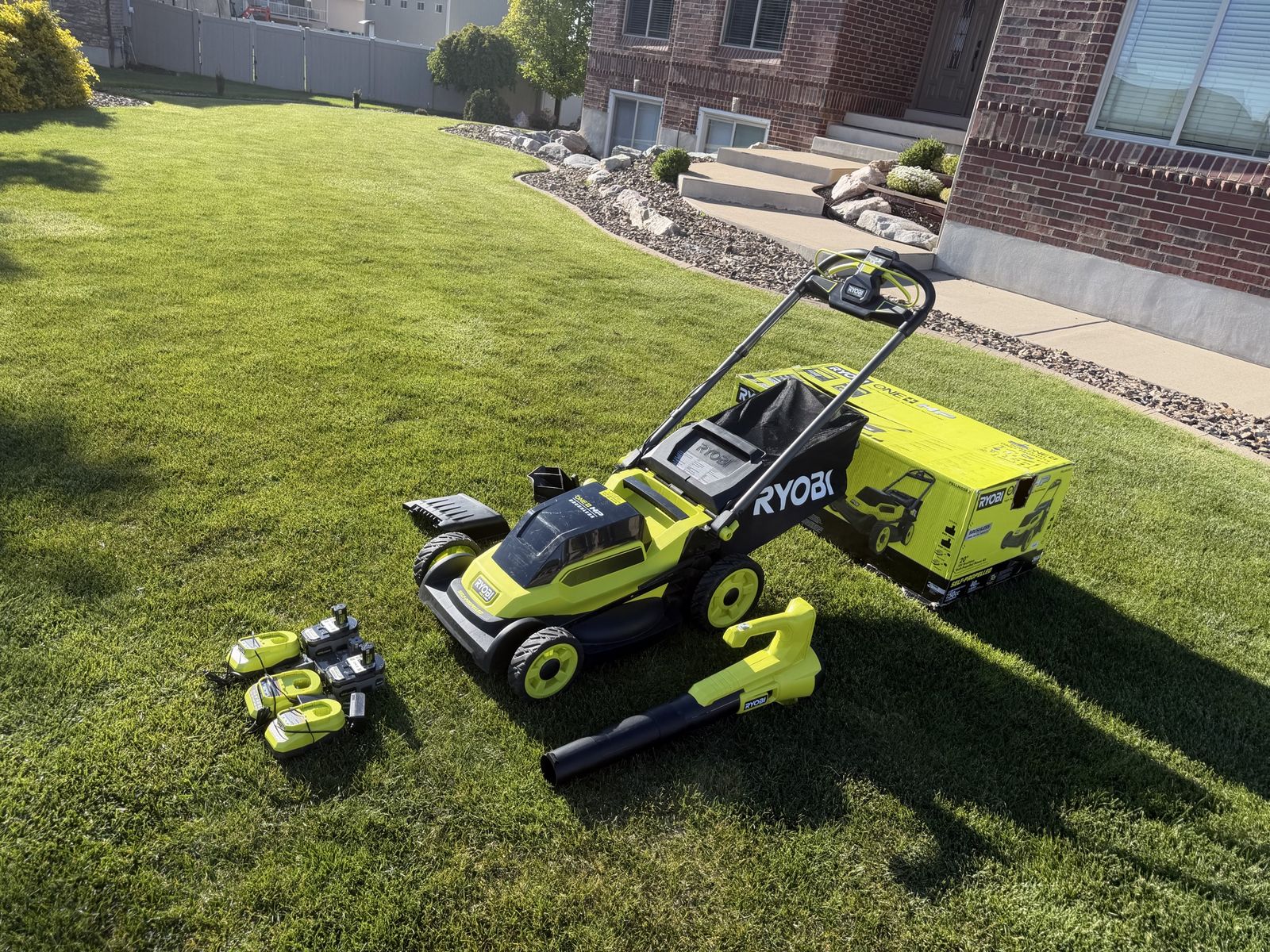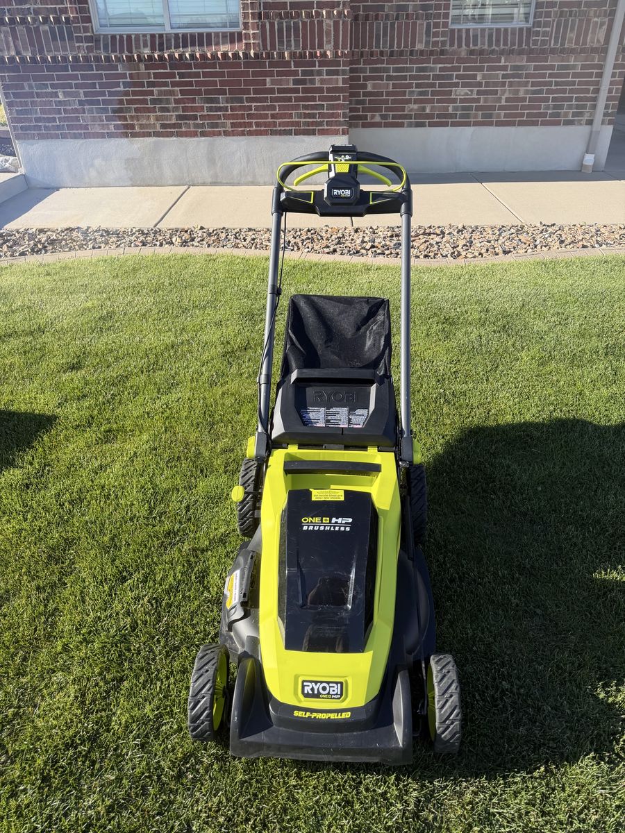 ApplePayRyobi self propelled lawn mower and blower with 3 batteries and 3 chargers. Works perfect and is basically brand new. Only used a handful of times.