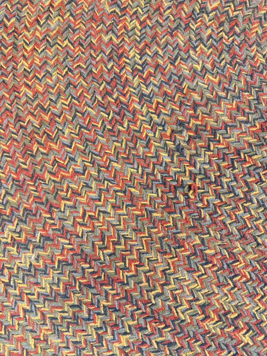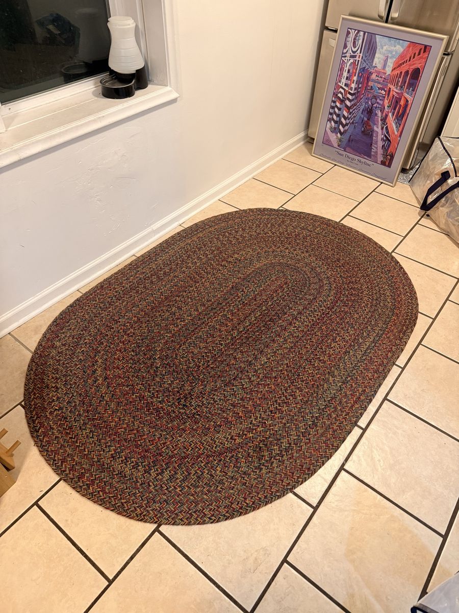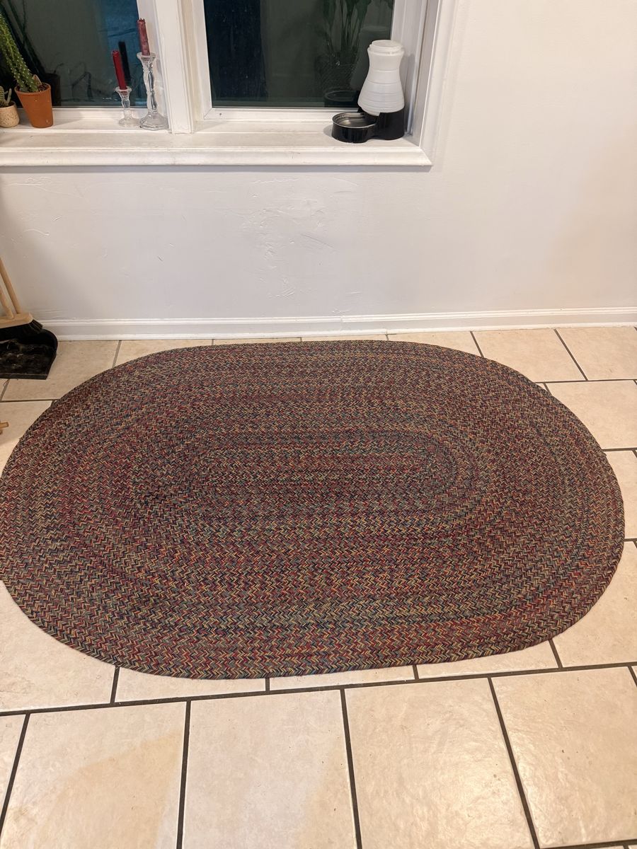 72” x 50” Oval Rug with rug mat cut to size. Super fun rug, I had it under my kitchen table and loved it!
