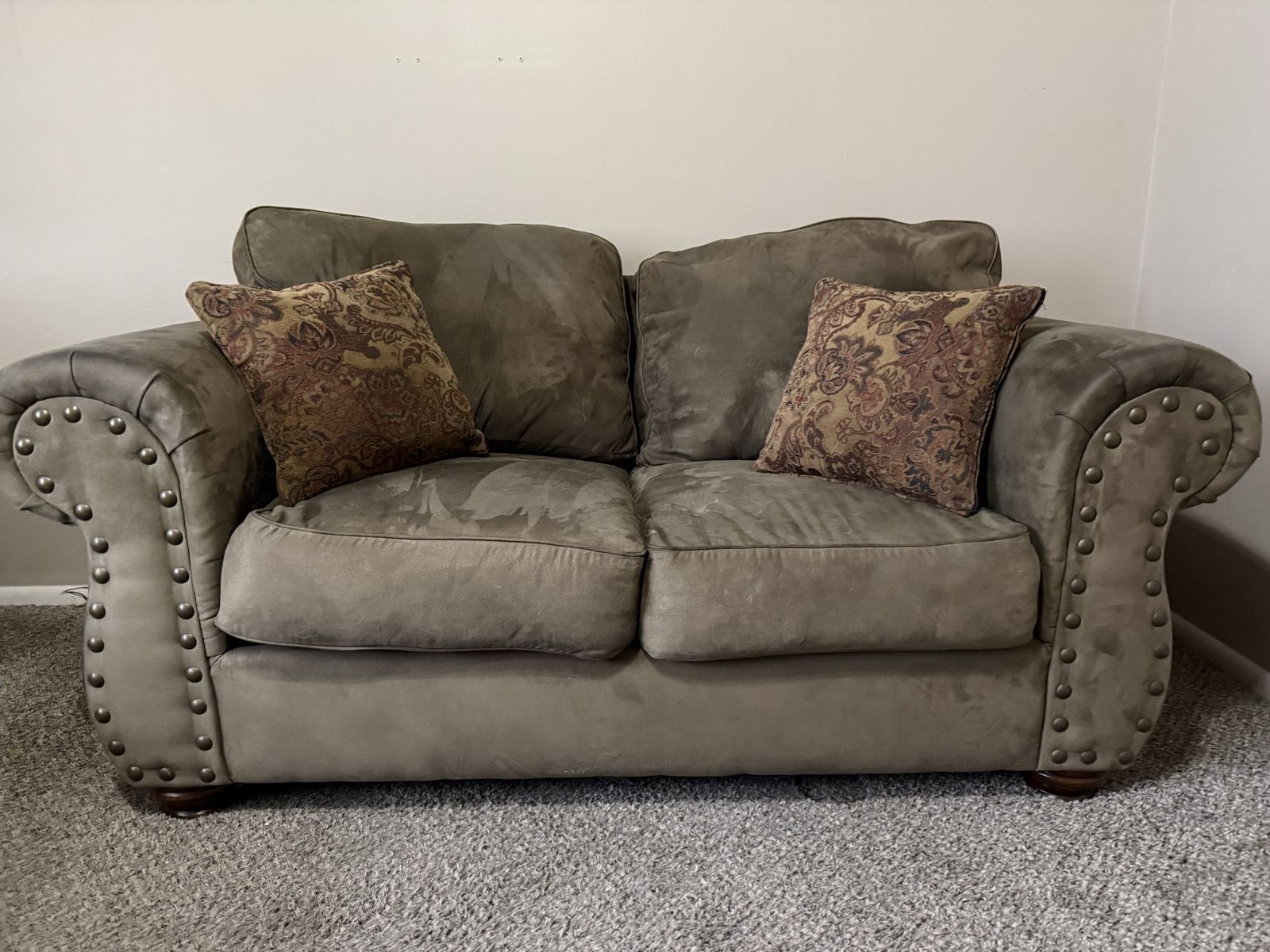 Selling a matching sofa and loveseat set. Both have been recently cleaned and vacuumed and are in good overall condition. They’re very comfortable and still have a lot of life left. Neutral color (dark olive green) makes them easy to match with most decor. Cushions are in good shape and the couches are sturdy. There is minor wear on one arm (slight indentation), but it doesn’t affect comfort or use. From a dog-friendly home, but thoroughly cleaned and I’ll vacuum them again before you come to pick them up! Asking $250 OBO – I’m trying to sell them before I move on Thursday the 30th so I’m open to reasonable offers. Must pick up.