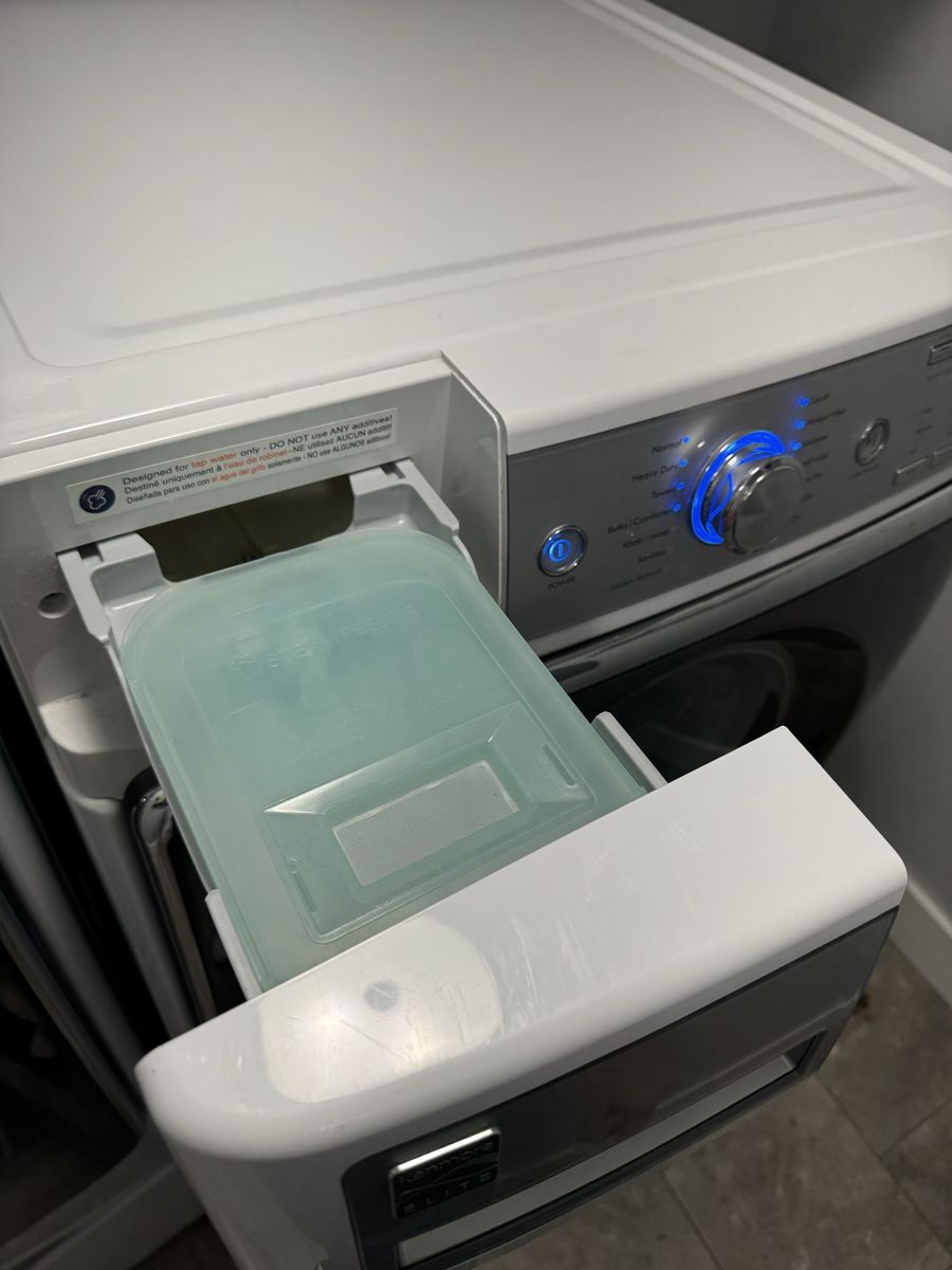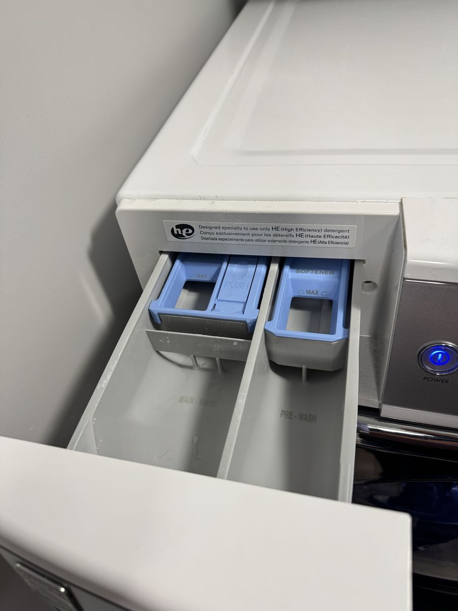 Quiet operation – no unusual noises No mildew or odors Washer recently had drain pump replaced Stainless steel braided water supply lines included Matching pedestal drawers included Clean inside and out Ready for immediate use