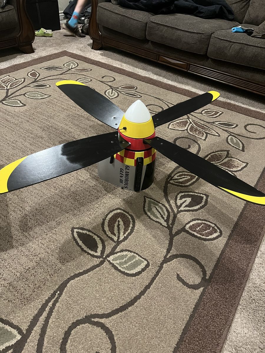 P51 Mustang ceiling fan. Everything works great. My kids loved it. Now they’re grown.
