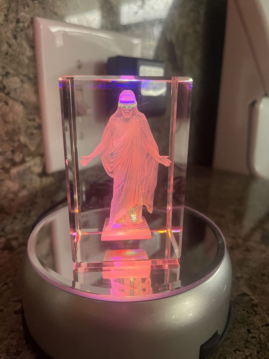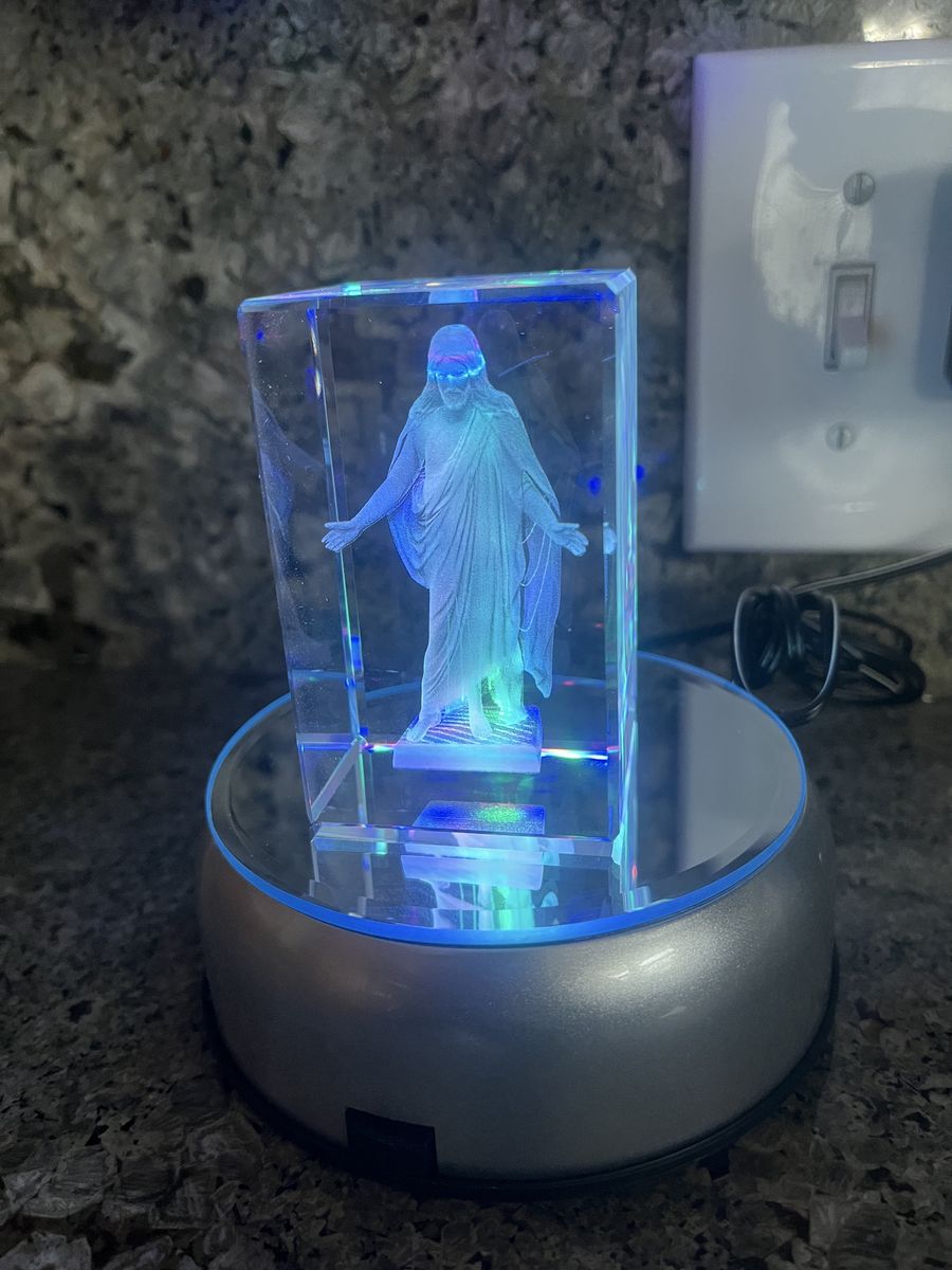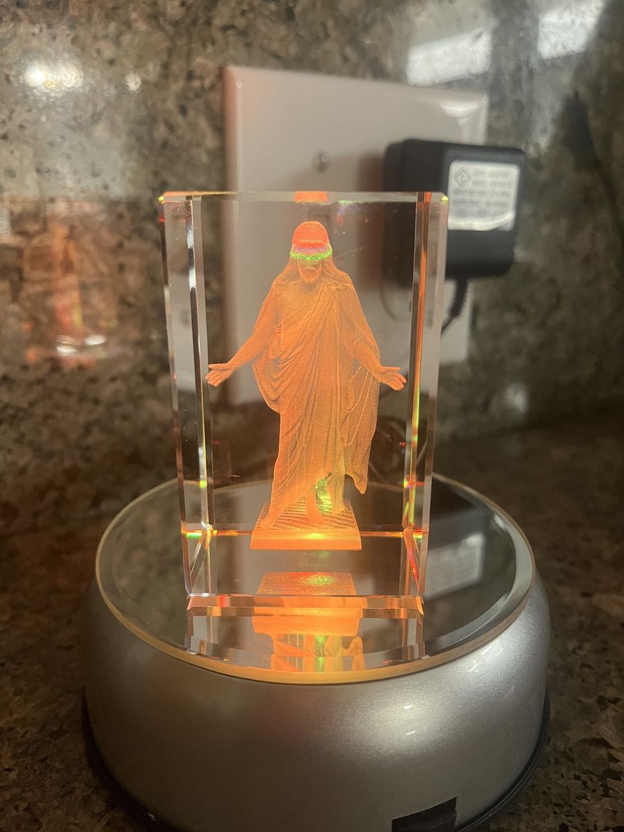 VenmoThis is really beautiful! The rotating base turns and it changes colors as it turns. The crystal cube has a laser engraved Christus inside it. The cube also has belveled sides for added elegance. When you put the crystal Christus on the rotating base it is beautiful! Add a touch of peace and beauty to your home with this. This would be a great gift. Price is firm.