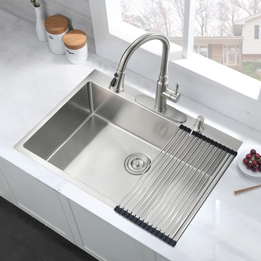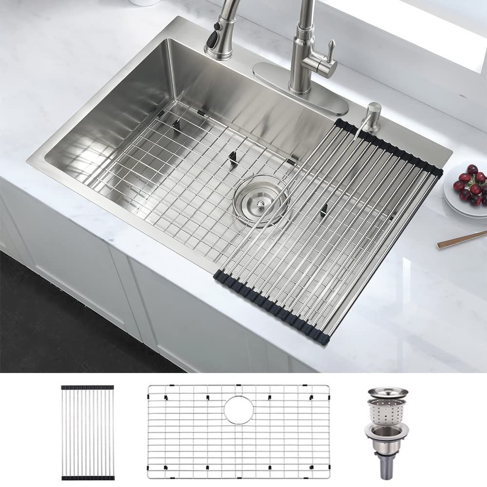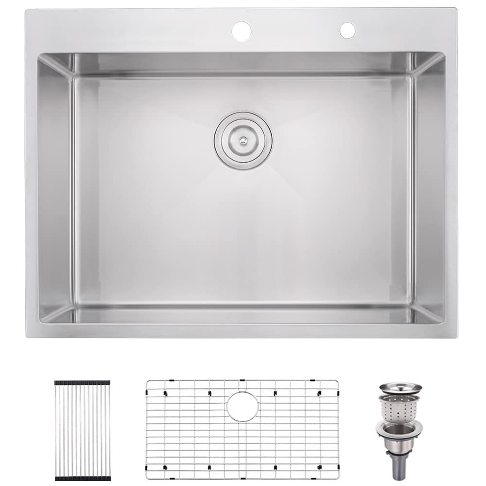 28 Inch Drop In Kitchen Sink Single Bowl, Topmount 16 Gauge Stainless Steel,Brushed Nickel Deep Basin 28x22x10