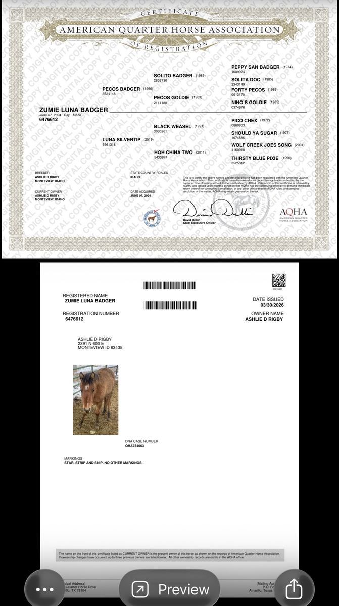For the past year it felt like I've been on that tv show Maury determining who this beautiful mare dad was. When I first tried to get her registered I thought Sam's Blue Boy was her dad. As Maury would say Sams Blue Boy you are not the father. After a years long journey genetic testing determined Pecos Badger is the father. This is a beautifullily built coming two year old mare. i would love to see someone take her onto great many adventures and see where they can take her. I have dreamt of breeding and raising good ranch horses and she comes great cow horse bloodlines.