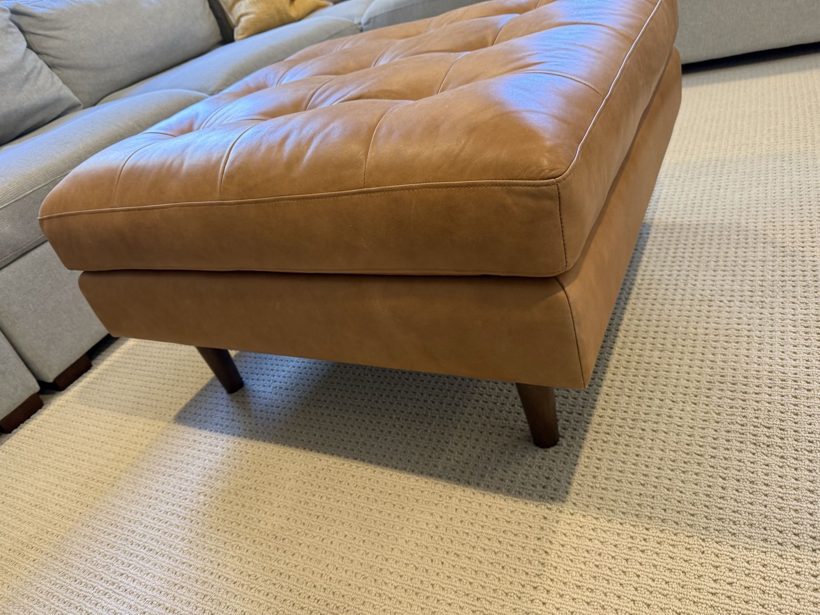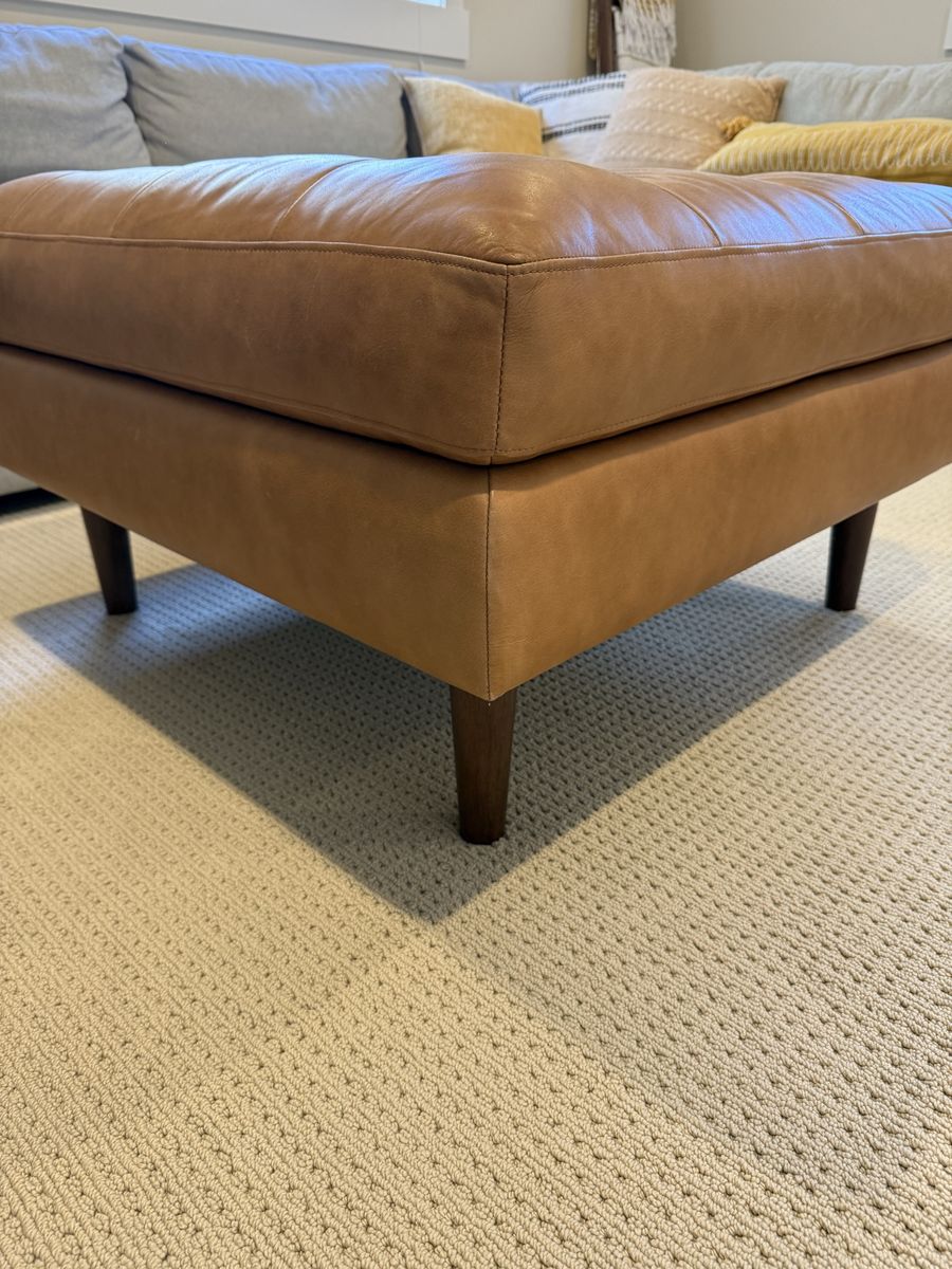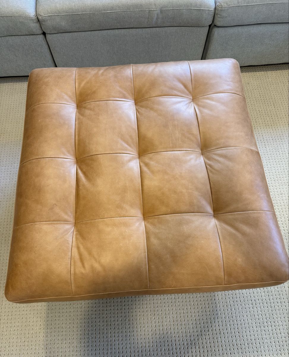 VenmoPoly & Bark Napa ottoman in cognac tan full-grain leather. Great as a footrest, extra seating, or even a coffee table.