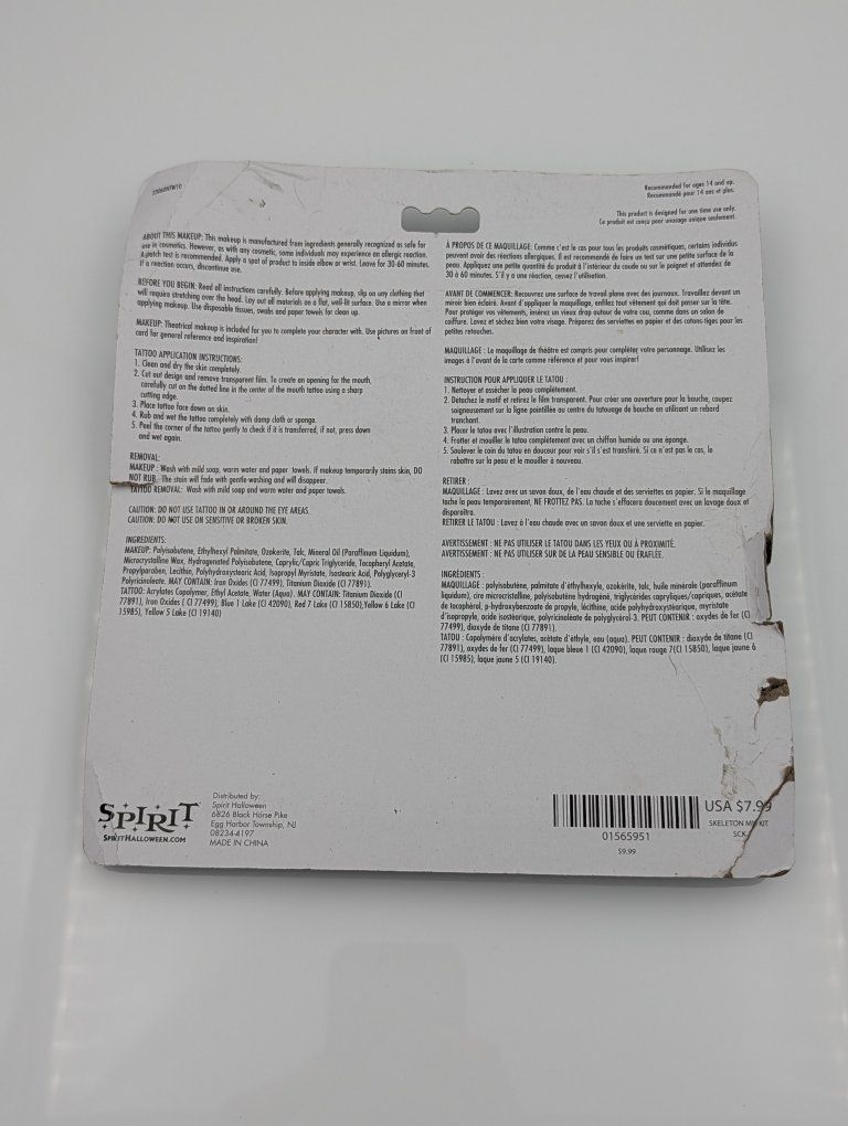 ZelleBrand: Spirit Halloween Model/Type: Skeleton Makeup Kit Contents: Makeup Tray, Tattoo, Sponge, Brush Color: Black / White
