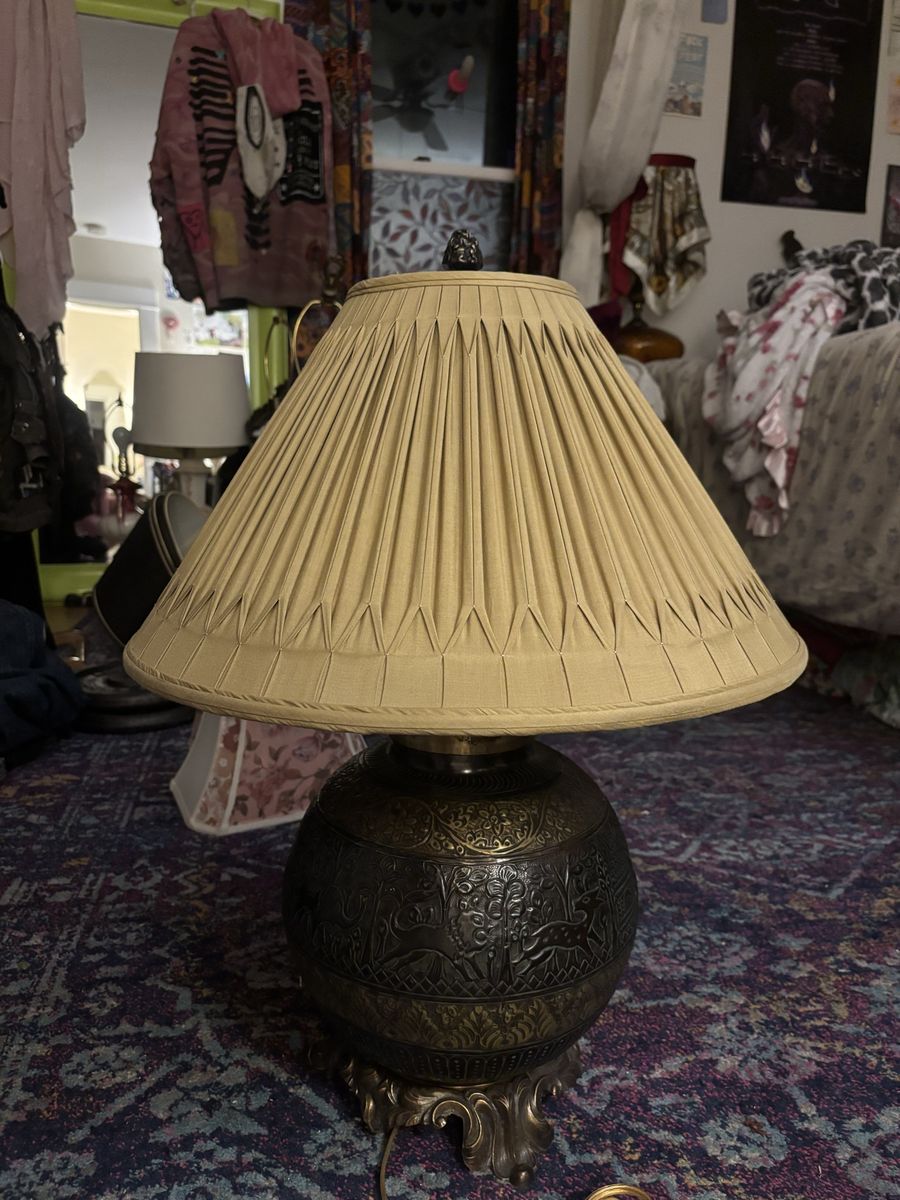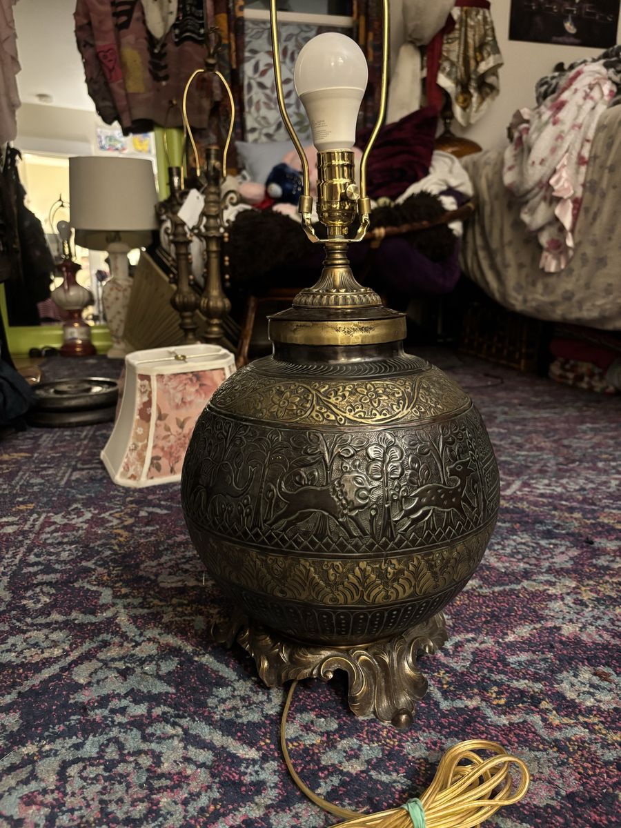 VenmoVery cool old lamo with animals on it!! Everything works I have used it :) Comes with lightbulb! Lamp is 28 in tall Base is 11 in wide Shade is 20 in wide