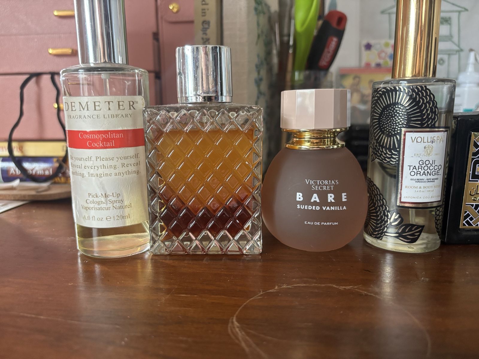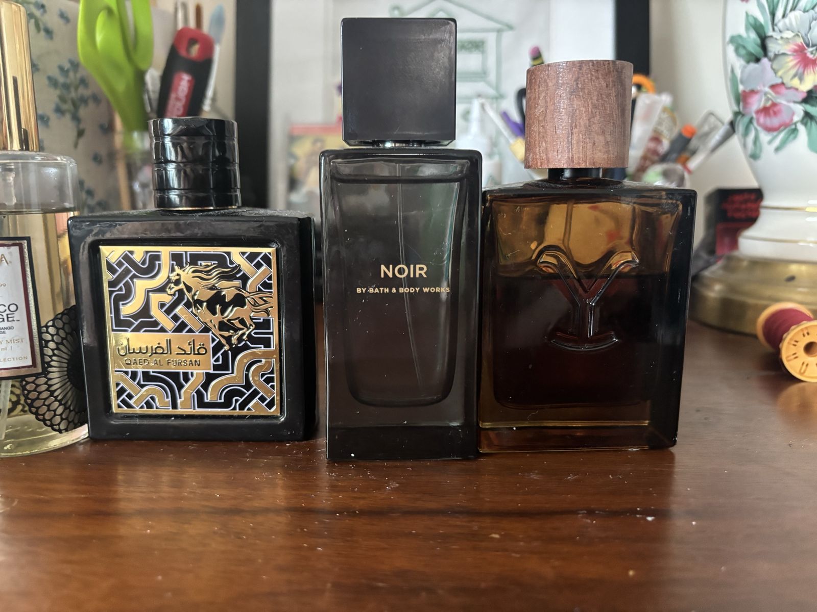 Demeter- cosmopolitan cocktail 10$ Victoria secret- bare vanilla sued 50$ Voluspa- Goji torocco orange 20$ Qaed Al Fursan 10$ Yellowstone - 50$ Bath and Body works- Noir 20$