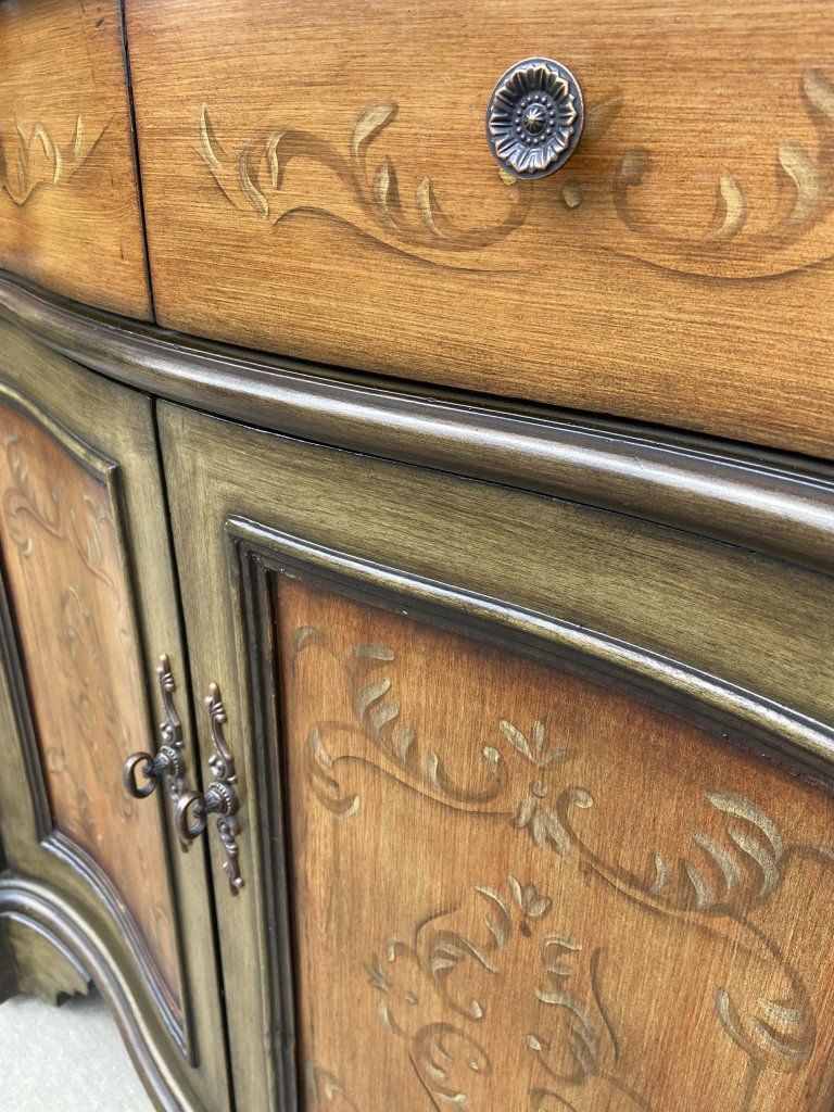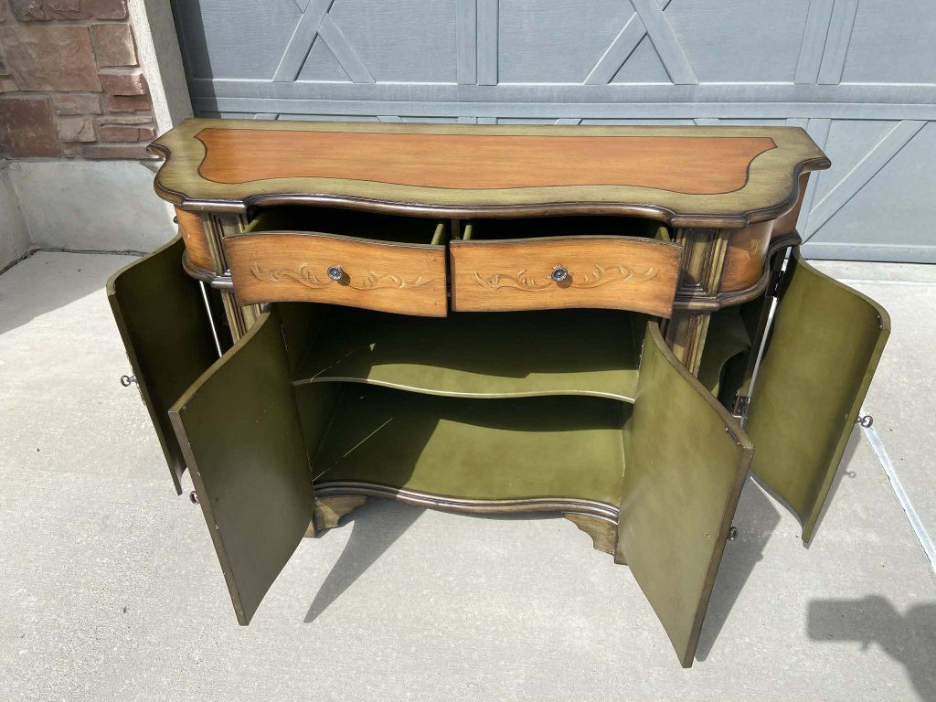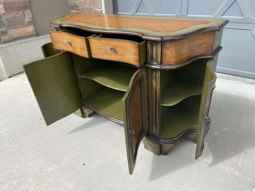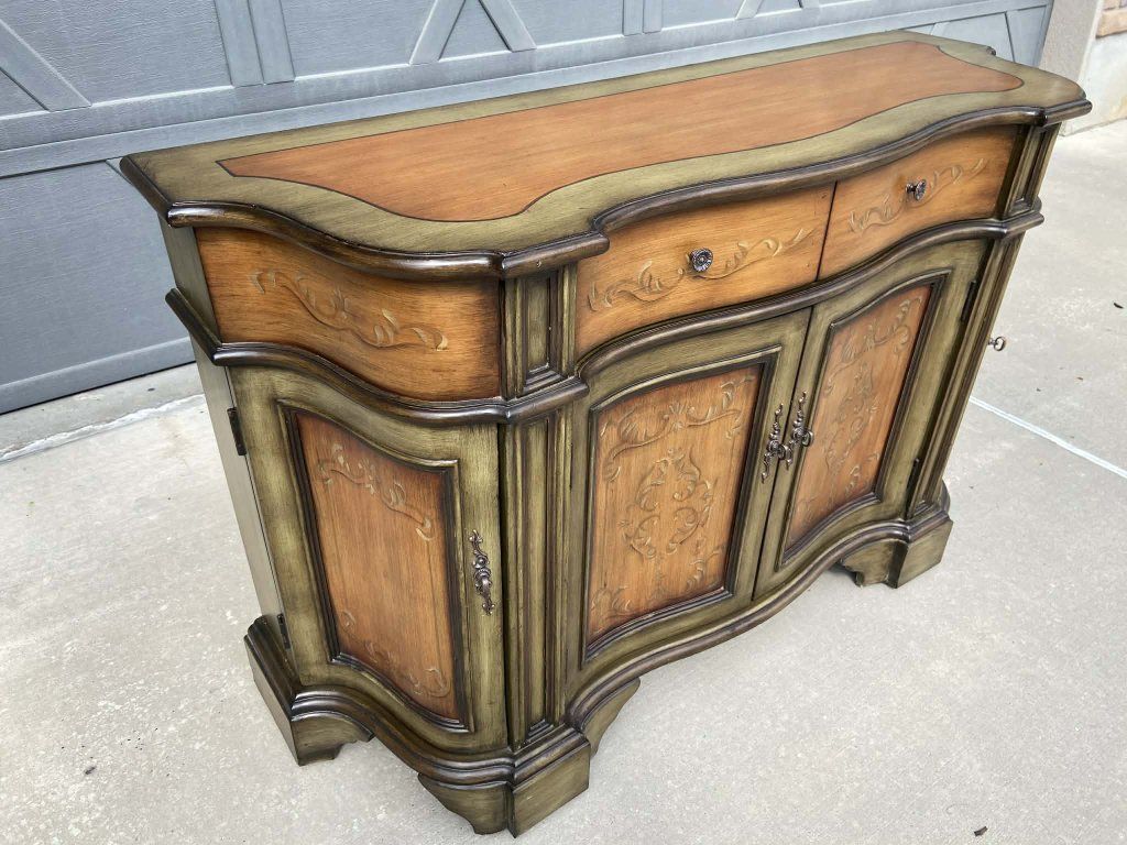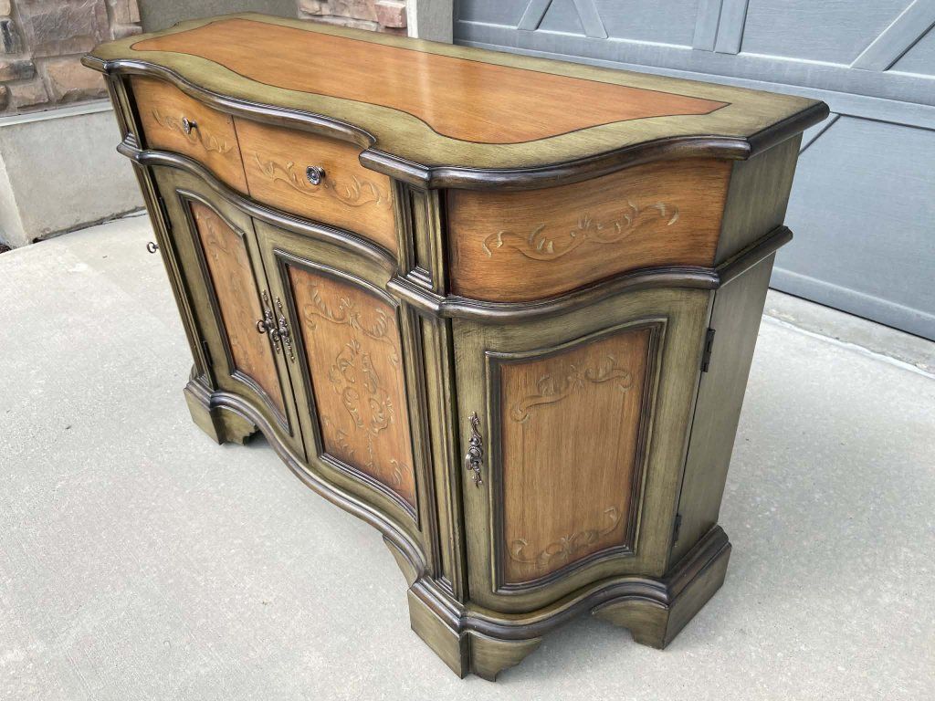 VenmoThis piece is a hand-painted Stein World Accent Credenza (model #42529), featuring a "Tuscan Green" and "Acorn" two-tone finish. Minor imperfections throughout. See all photos. Measurements: H 34.75" W 54" D 18" Pick up in South Jordan, Venmo or cash. FREE curbside delivery within 5 miles of South Jordan. Delivery outside of parameters may be available with fee, message to inquire. All sales are final. Thanks for looking, please check out my other listing's. :)